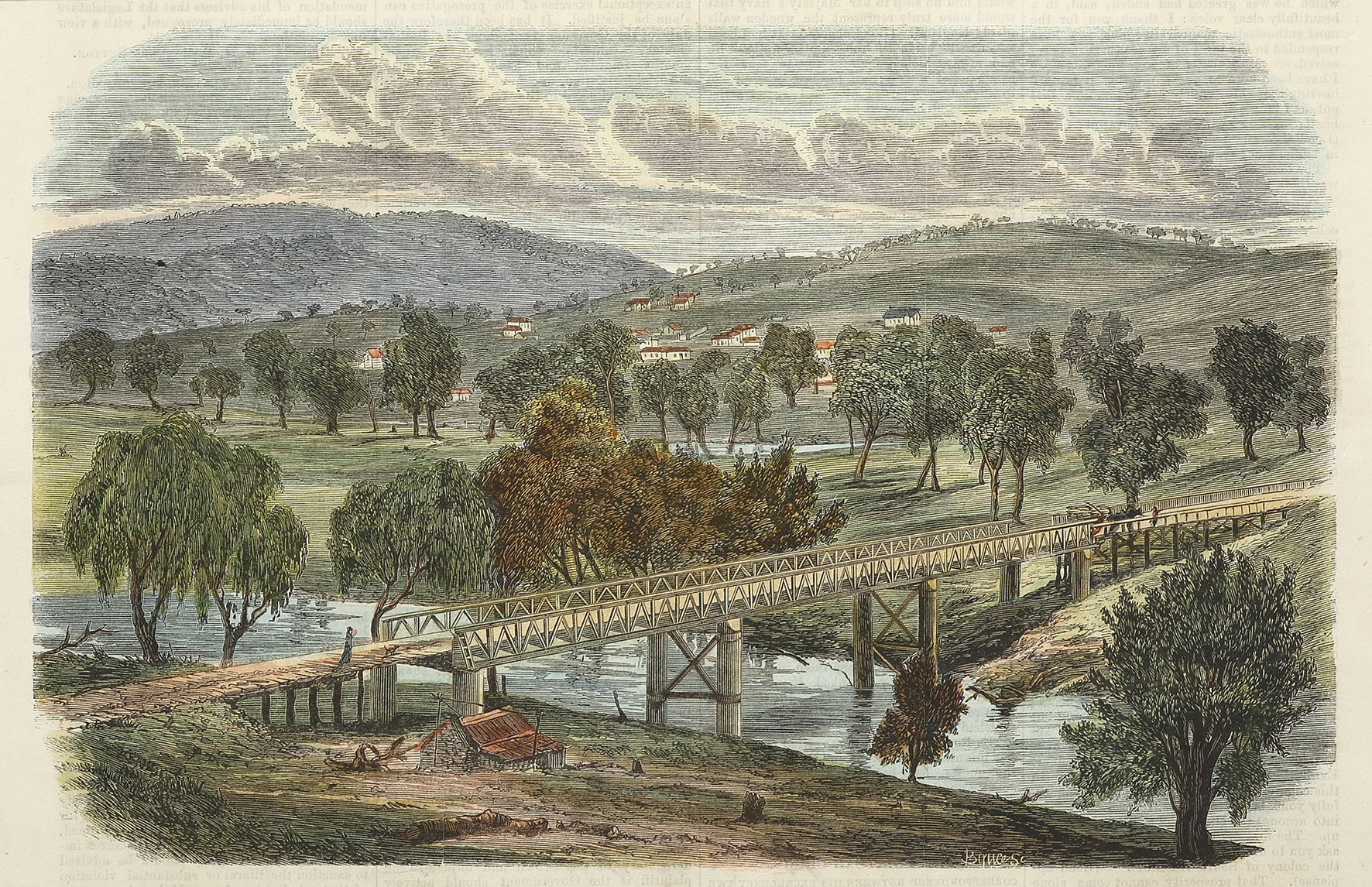 Scarce colonial engraving of the Prince Alfred Bridge, Gundagai. The bridge was a wrought iron truss and timber beam road bridge over the Murrumbidgee River built in 1865.