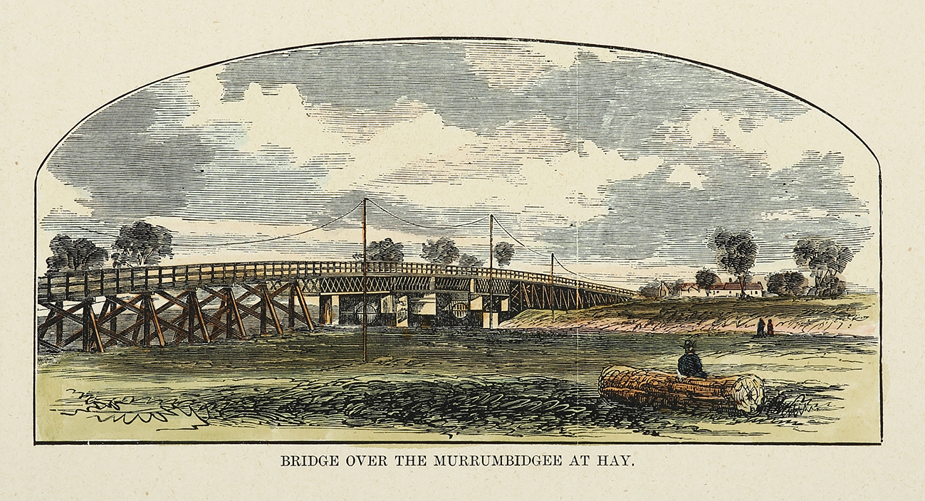 Scarce engraving of the original Hay bridge over the Murrumbidgee.
