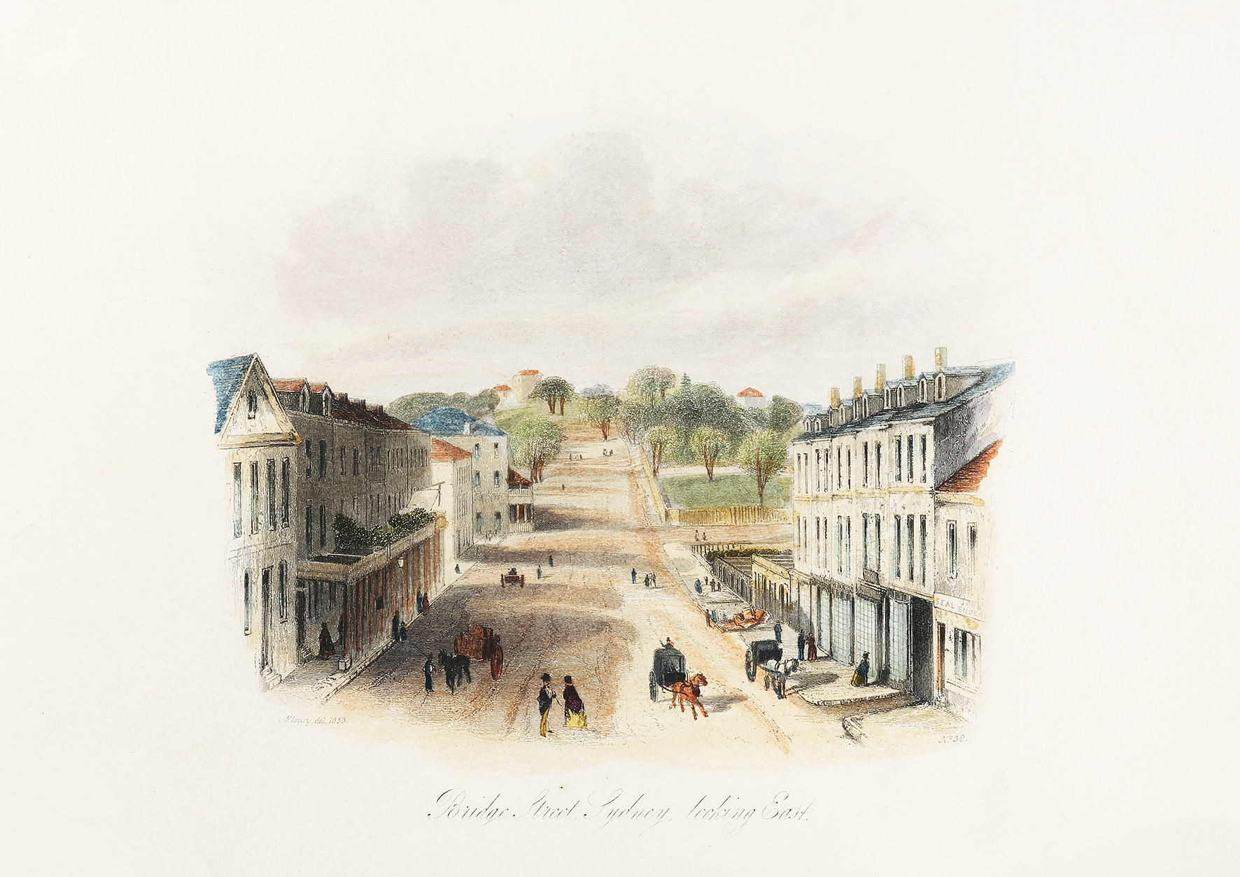 Scarce, c.19th hand coloured engraved view of Bridge street, Sydney looking east.