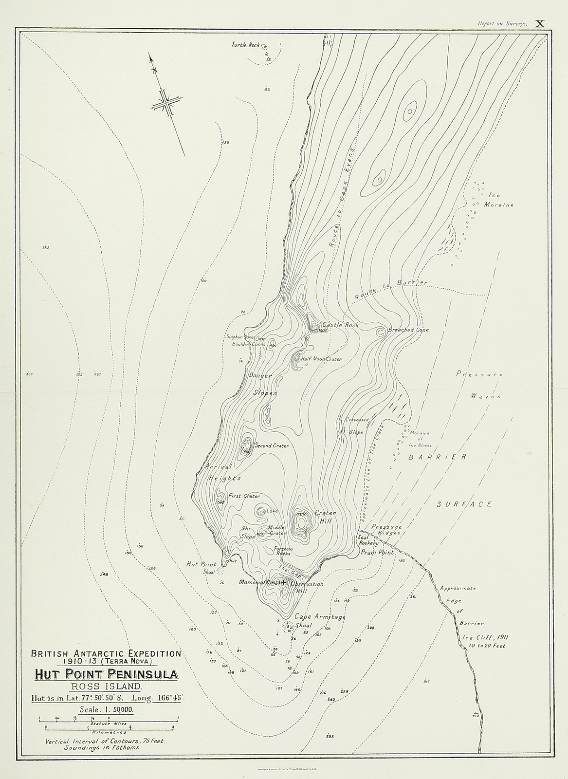 Scarce c.20th map of Hut Point Peninsula, Ross Island, from the resulting mapping of Captain Robert Falcon Scott’s expedition to Antarctica 1910-1913. Scott led the Terra Nova Expedition and his ambition was to be the first to reach the geographic South Pole.