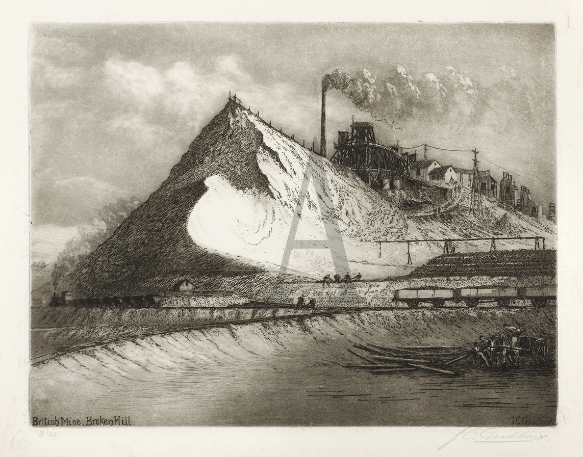 Goodhart’s earliest prints were of his immediate Broken Hill environment. Success came quickly. The National Gallery of Victoria purchased the mining subject Klondyke Propty. Mine, from his 1926 exhibition, and two more prints in 1930. The Art Gallery of South Australia acquired The Poppet Head and Molle Street Bridge, Hobart in 1928; also in that year Goodhart was elected a member of the Australian Painters Etchers’ Society with whom he exhibited regularly until 1936. Goodhart’s position amongst Australian printmakers was assured when in 1928 Campbell Dodgson, Keeper of Prints and Drawings at the British Museum wrote informing him of his interest in a group of five prints, following which, in April 1929, two of his etchings The Poppet Head and Klondyke Propty. Mine were exhibited at the Paris Salon.