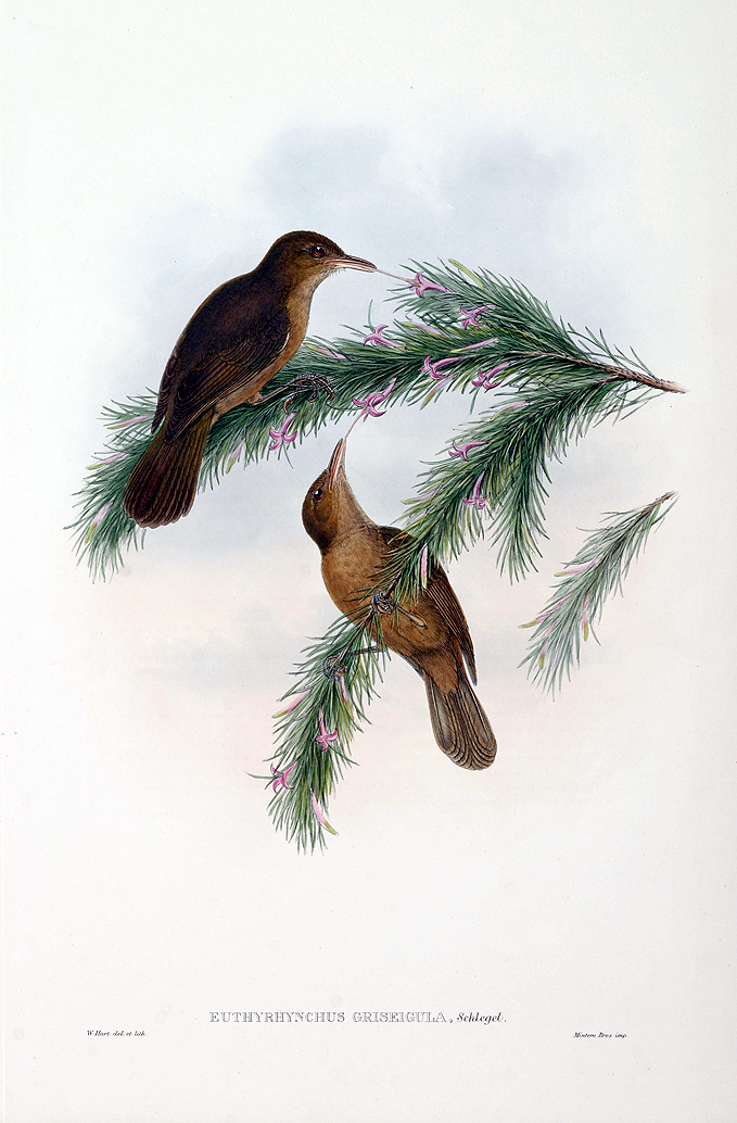 Gould was born in 1804, at Lyme Regis in Dorset. In 1818 his father was appointed a foreman gardener at the Royal Gardens, Windsor Castle. As a youth Gould also trained at these gardens and became an expert in taxidermy. In 1825 Gould moved to London and set himself up as a self-employed taxidermist. He was the first known taxidermist to have received royal patronage after preserving a Thick-kneed Bustard for King George IV. Numerous orders followed from the king with the most arduous task being stuffing the famous giraffe given by the Pasha of Egypt. He met and married Elizabeth Coxen in 1827. A talented artist in her own right, Elizabeth’s drawings and lithographic skills were fundamental to the success of John Gould’s renowned publications. In 1830, he obtained a number of specimens of the exotic and little-known birds of Northern India, forming the bold idea of issuing a book about them, which was rejected by the publishers. Gould was determined to issue the book himself at his own expense and so he arranged for his talented wife to draw and lithograph the plates form his own sketches. He persuaded N.A. Vigors to write the text for him and then set about getting subscribers for his publication. At this, he was spectacularly successful and this list was headed by Victoria (Queen from 1837) and Prince Albert, an emperor, a king, three princes and nine dukes. The resulting book, A Century of Birds… from the Himalaya Mountains, was published in 1832. This folio size (550mm x 380mm) was to become his format for all his great works. Encouraged by the response to his first book, Gould set about on a more ambitious project: an attempt to illustrate all of the birds of Europe. He engaged Edward Lear to share the job of illustrating the work with Elizabeth and between them they produced 449 plates for the Birds of Europe which was completed in 1837. This established Gould not only in the eyes of the public but also within the scientific community. He then sailed to Australia in May 1838 with his wife and eldest son, aged 7, a young nephew, a man-servant and a maid-servant, and his collector John Gilbert. He stayed in Australia for two years leaving from Sydney on 9 April 1840. On his return he took on his greatest work, The Birds of Australia begun in London on 1 December 1840. The final parts, making a total of thirty-six, appeared in 1848. They were bound in seven volumes and the cost to subscribers was £115. A supplement volume issued in parts was completed in 1869. The Birds of New Guinea and the Adjacent Papuan Islands, Gould’s last great work, was completed after his death by Richard Bowdler Sharpe. Gould prepared the first twelve of the 25 original parts of the work, while Sharpe, Gould’s protégé and devoted friend, was responsible for the remainder of the monograph. Sharpe was more than forty years junior to Gould, whom he had met when he was only fifteen, and they both shared a passionate interest in ornithology. In his last years, although an invalid and often in pain, Gould was always pleased when Sharpe visited him to look at his collection of skins and discuss the latest bird discoveries. No other ornithologist can claim to have discovered and illustrated faithfully so many species of birds. The Birds of New Guinea are a fitting tribute to a long and prolific life in the field or ornithology. They are a magnificent record of the exotic world that John Gould so dearly loved, not only for the scientific value but also for his love of nature.