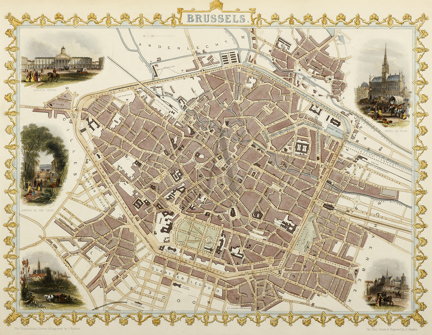 Superb and very decorative map of Brussels with numerous insets.