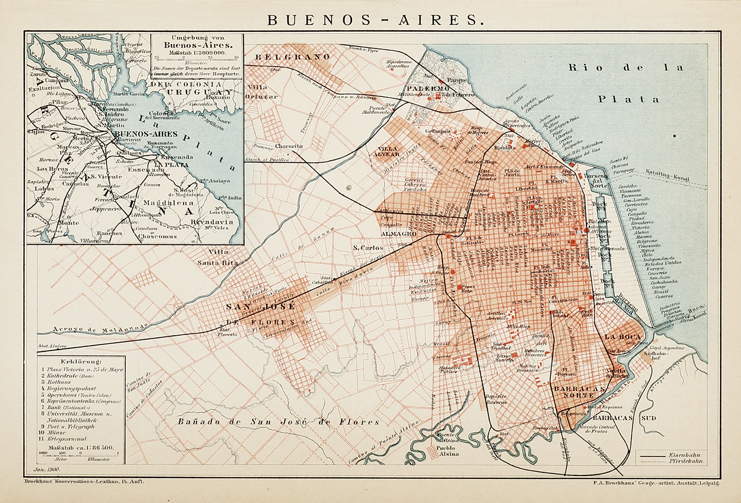 Detailed c.20th German colour lithograph plan of Buenos Aires. From Brockhaus, F.A. Konversations Lexikon. Collections: National Library Australia: Bib ID 1104411