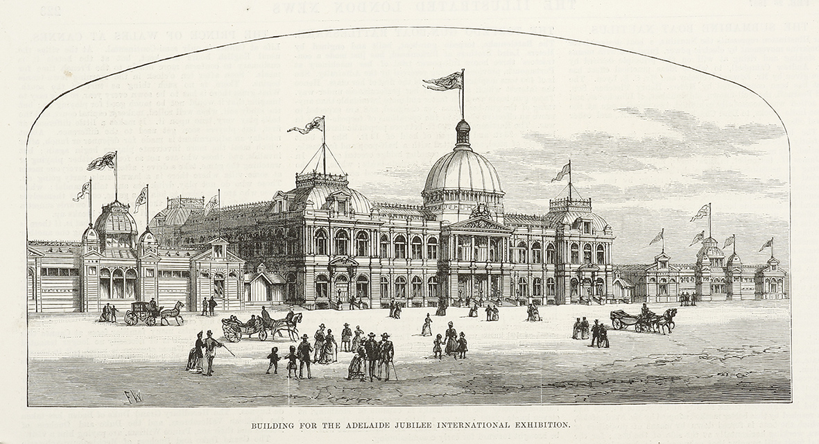 Colonial engraving of the Jubilee Exhibition Building which was on North Terrace and the official opening ceremony took place on 21 June 1887. It was demolished in 1962 and replaced by the University of Adelaide’s Napier Building,