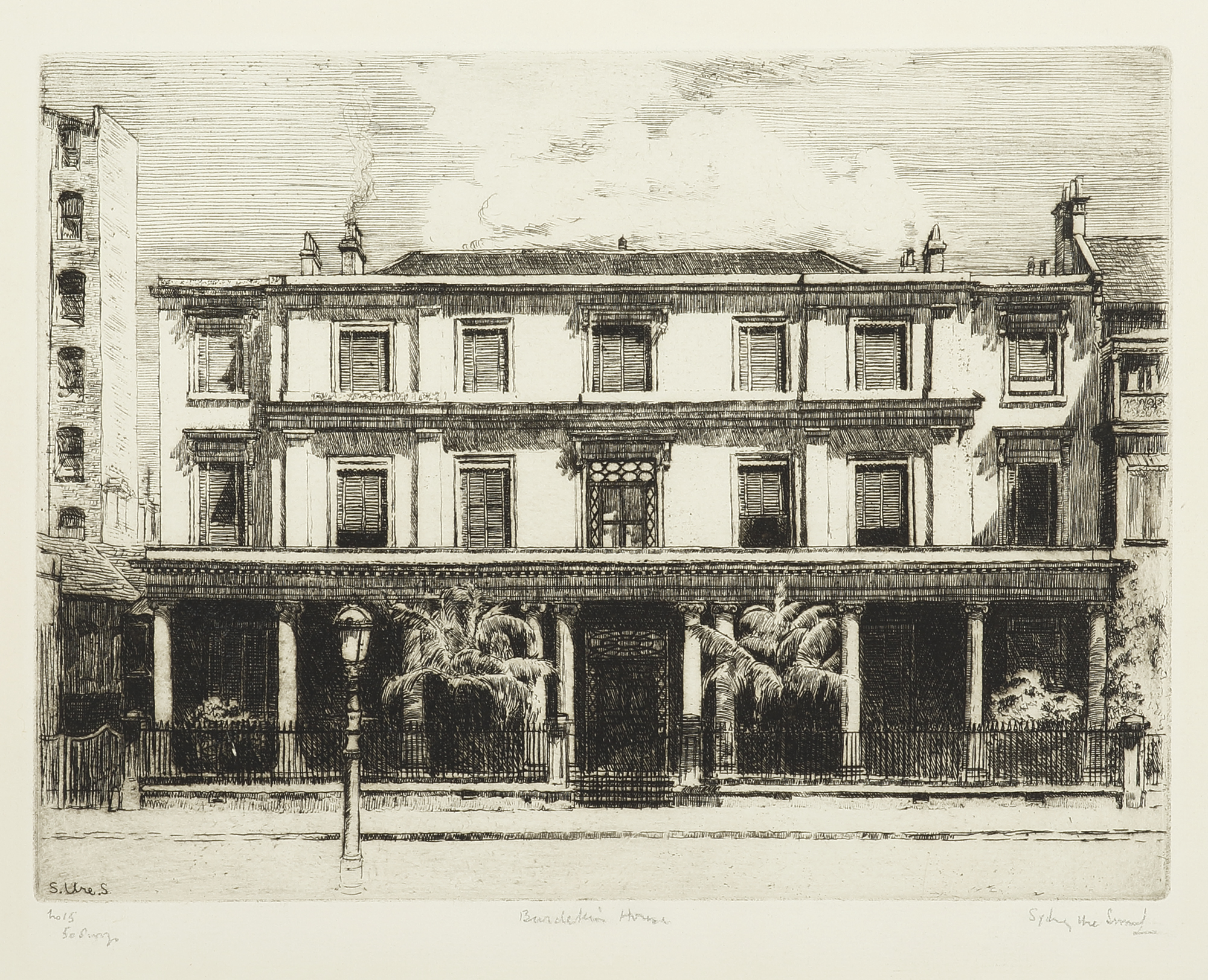Fine etching by the master print maker Sydney Ure Smith of Burdekin House, Macquarie Street, Sydney. It was described as Sydney’s ‘finest private residence‘. It was built by merchant Thomas Burdekin in 1842 and demolition in 1933. Exhibition history: 1923 … Read Full Description