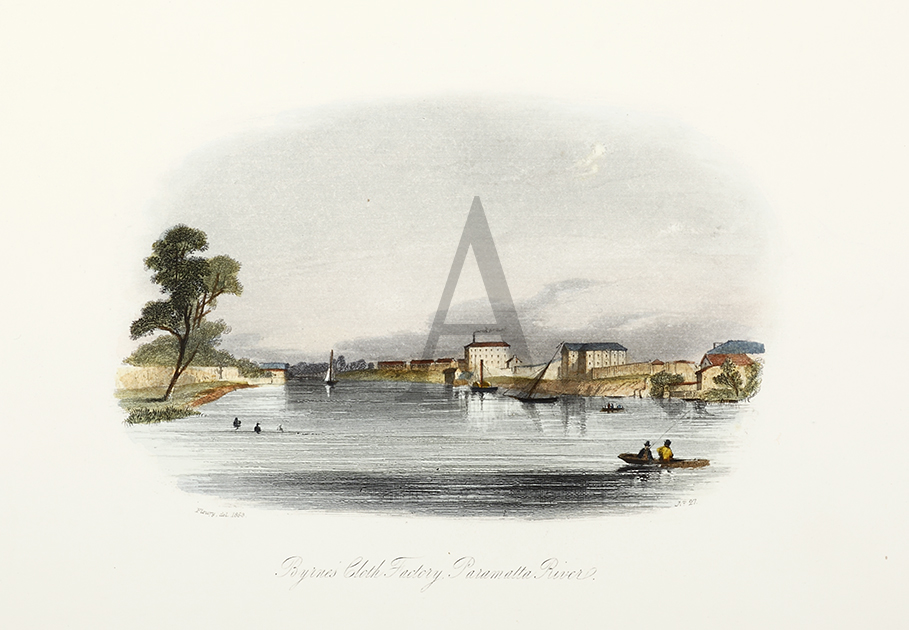 Scarce c.19th hand coloured engraving of Byrne’s cloth Factory on the Parramatta River in 1854.
