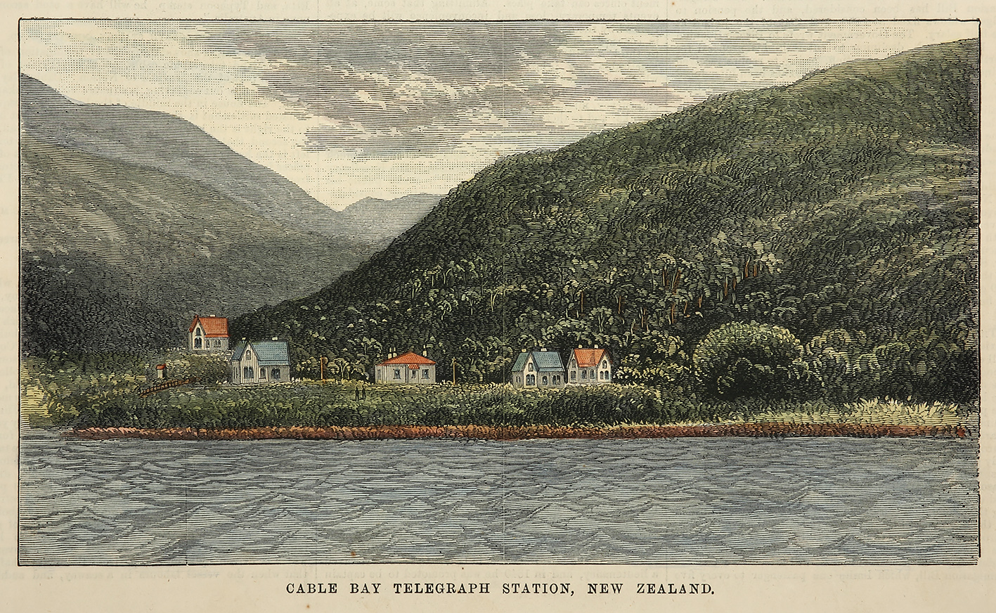 Scarce hand coloured c.19th engraving of Cable Bay, New Zealand. Cable Bay was named from the fact the town was New Zealand’s first overseas cable link, to Australia, which was opened on 21 February 1876. From the original edition of … Read Full Description