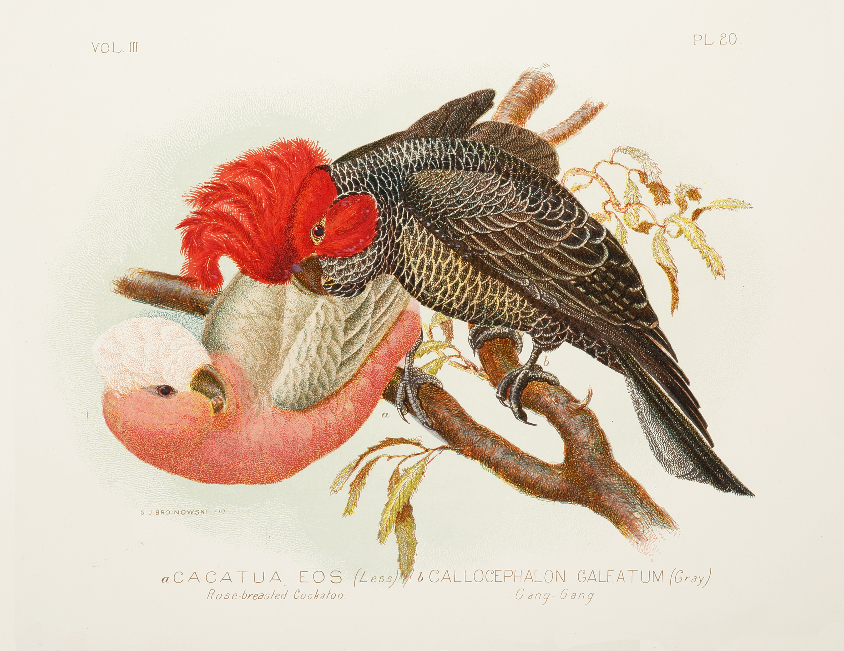 One of the few colonial images of a Gang-Gang, here depicted with a Galah.