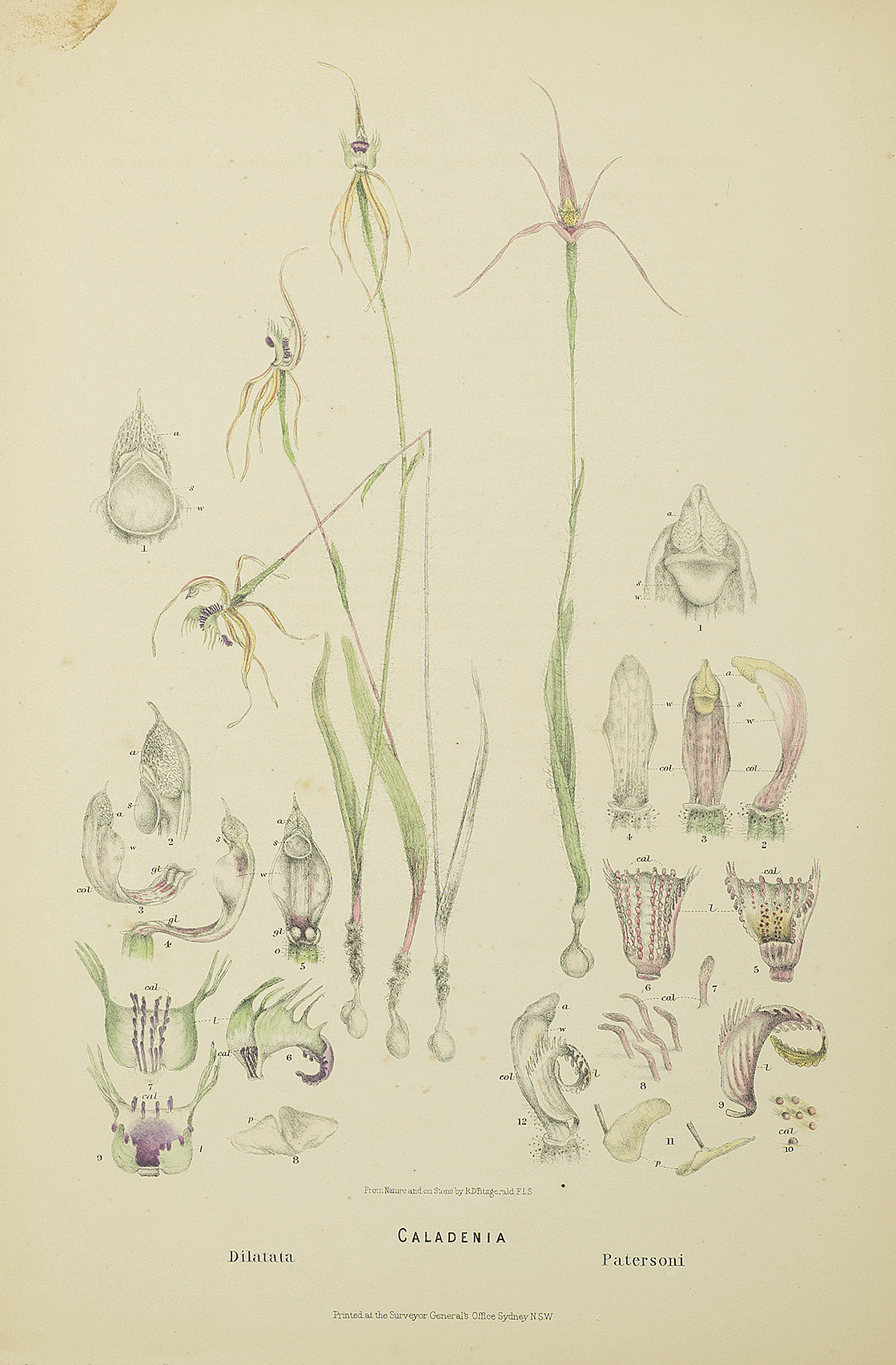 Robert Fitzgerald (1830-1902) Fitzgerald was a surveyor and naturalist, and arrived in Sydney from Ireland in 1856 and soon after was appointed to the Department of Lands as a draftsman for the crown. In his own time Fitzgerald pursued his interest in botany and in 1864 travelled to Wallis Lake, north of Newcastle in New South Wales to collect ferns and orchids which he intended to cultivate around his Hunter's Hill home. This interest in orchids was maintained throughout his life and in 1869, 1871 and 1876 he visited Lord Howe Island to collect further botanical samples. It was during this time that he discovered Dracophyllum fitzgeraldii F. Muell, which was later to be named in his honour. He worked for the Department of Lands and was an enthusiastic field collector, devoting himself especially to the native orchids. The publication of the 'Australian Orchids' was acclaimed throughout the botanical world. J.D. Hooker considered it 'a work which would bring honour to any country and to any botanist', while George Bentham wrote 'thanks to you the Australian Orchidaceae are now better known than those of any country out of Europe'.