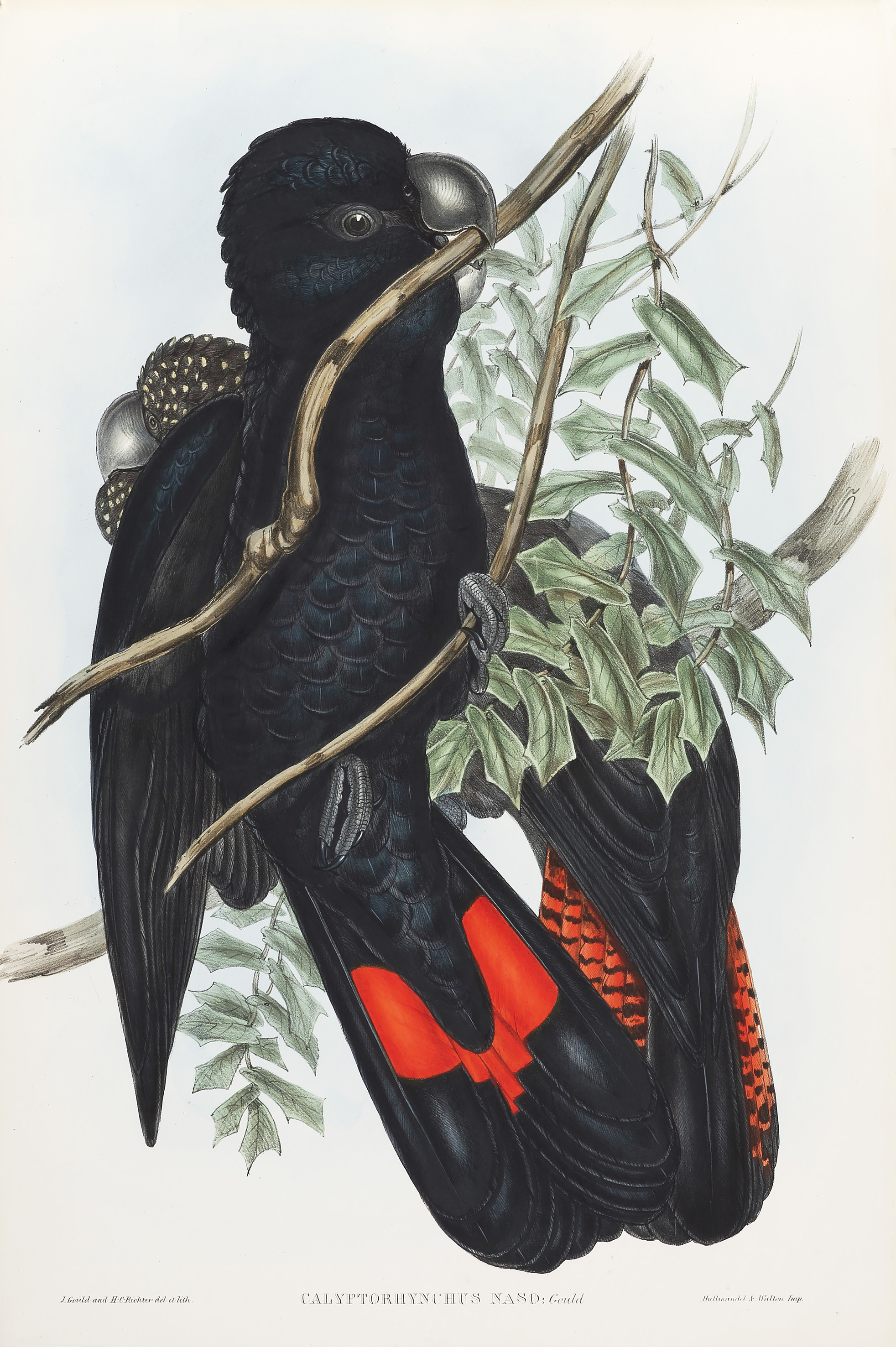 Magnificent and rare, c.19th hand coloured lithograph of the Forest Red-Tailed Black-Cockatoo by John Gould from his epic series, The Birds of Australia and Adjacent Islands, published for the author, printed by Richard and John E. Taylor, London. Was the first to described by the ornithologist John Latham in 1790 as Psittacus banksii, commemorating English botanist Sir Joseph Banks. The red-tailed black cockatoo also has the distinction of being the first bird from Eastern Australia illustrated by a European, as a female, presumably collected at Endeavour River in north Queensland, was sketched by Banks’ draughtsman Sydney Parkinson in 1770.