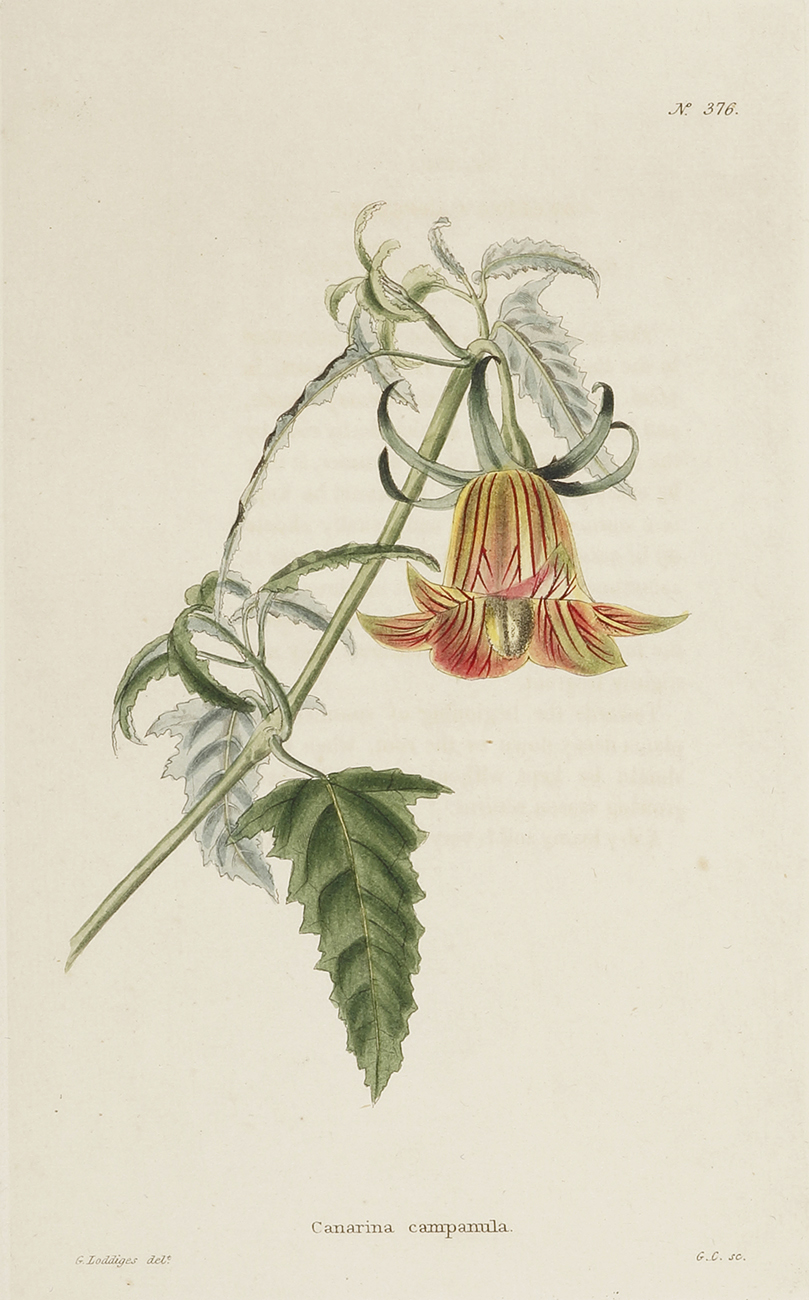 Fine early c.19th botanical engraving of the Canary Island Bellflower by Conrad Loddiges, The Botanical Cabinet, which was published from 1817 to 1822. Conrad Loddiges, a Dutch-born horticulturalist, settled in Hackney as a nurseryman in about 1761 and introduced many … Read Full Description