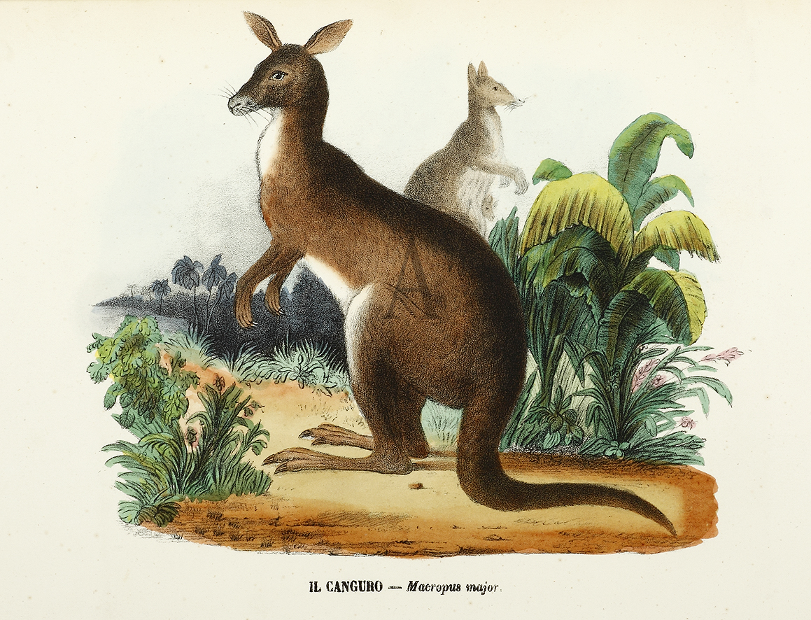 The first illustration of a Macropod was made prior to the Stubb’s illustration, titled ‘Kangaron’ and made on 15th November 1629 by Matthys Pool and described by Cornelis de Bruyn in Reizen over Moskovie door Persie en Indie, 1714 but the animal depicted was not an Australian species but Thylogale brunii (Dusky Pademelon), a Filander native to New Guinea.