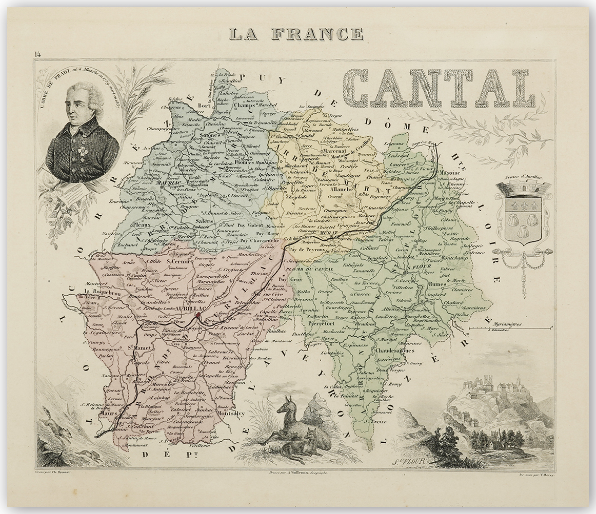 Decorative C19th map of Cantal with numerous vignettes, one of the town of Saint-Flour and a portrait of the French Ambassador and clergyman Dominique-Georges-Frédéric Dufour de Pradt.