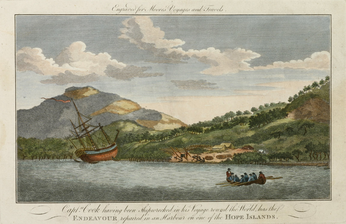 Image of Cook’s ship the Endeavour, depicted here being careened near present day Cooktown, after hitting a reef. On Cook’s chart of Endeavour River he gives the name, “The Labyrinth” to the Great Barrier Reef.