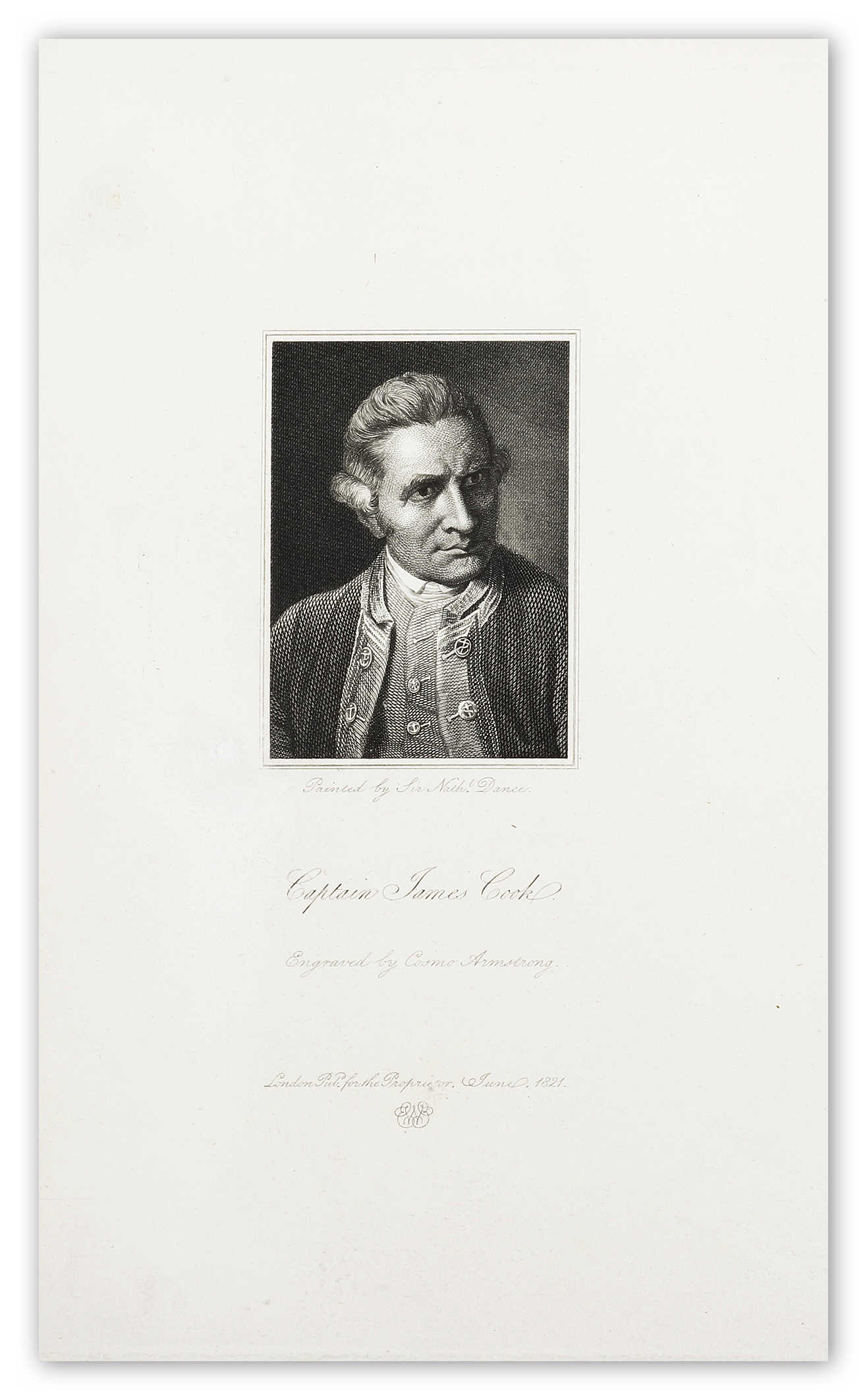 Famous head and shoulder portrait of Captain Cook derived from the seated portrait of him holding a chart issued in the second voyage account.