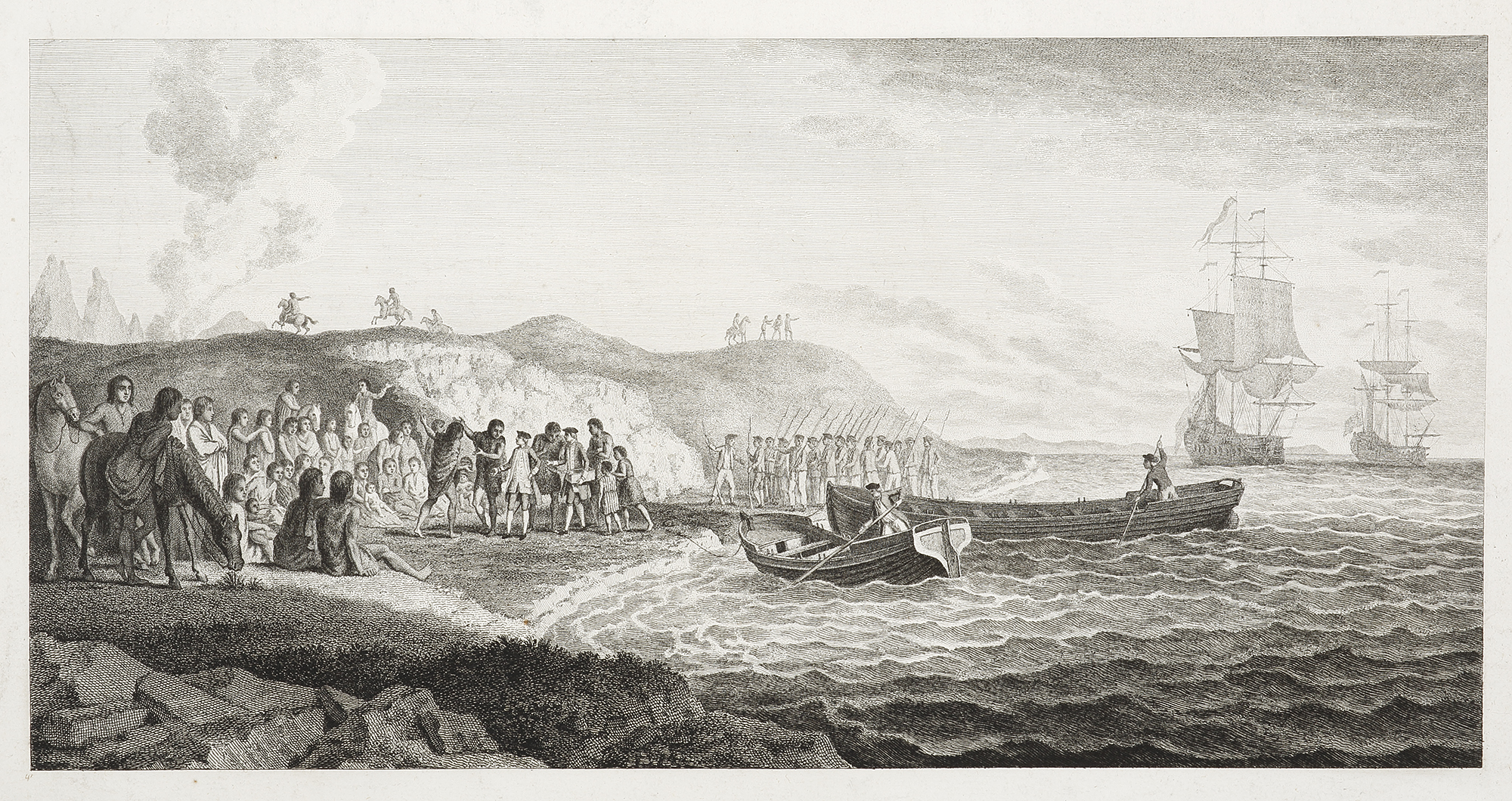 Very rare unfolded issue of this famous engraving of Captain John Byron landing a party at Patagonia, Strait of Magellan on Friday 21 December, 1764.