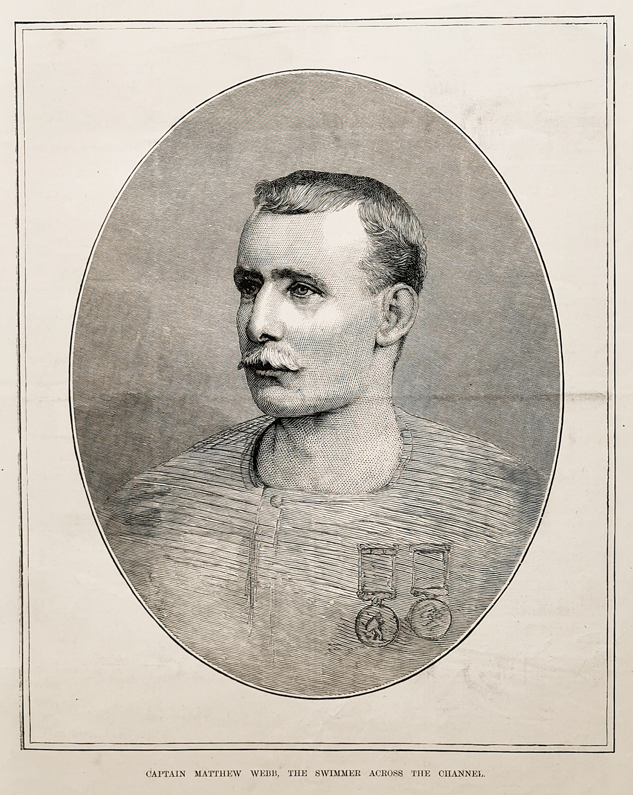 Engraving of Captain Matthew Webb (19 January 1848 – 24 July 1883) the first recorded person to swim the English Channel for sport without the use of artificial aids. In 1875, Webb swam from Dover to Calais in less than 22 hours. This brought him great celebrity, and he performed many stunts in public. He died trying to swim the Whirlpool Rapids below Niagara Falls, a feat declared impossible.