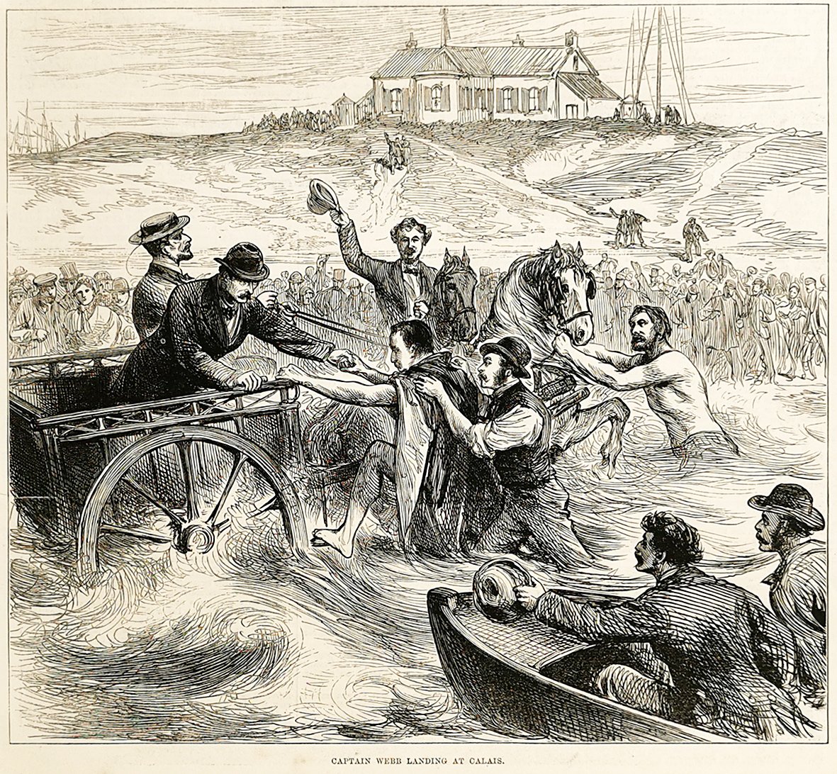 Engraving of Captain Matthew Webb (19 January 1848 – 24 July 1883) the first recorded person to swim the English Channel for sport without the use of artificial aids. In 1875, Webb swam from Dover to Calais in less than 22 hours. This brought him great celebrity, and he performed many stunts in public. He died trying to swim the Whirlpool Rapids below Niagara Falls, a feat declared impossible.