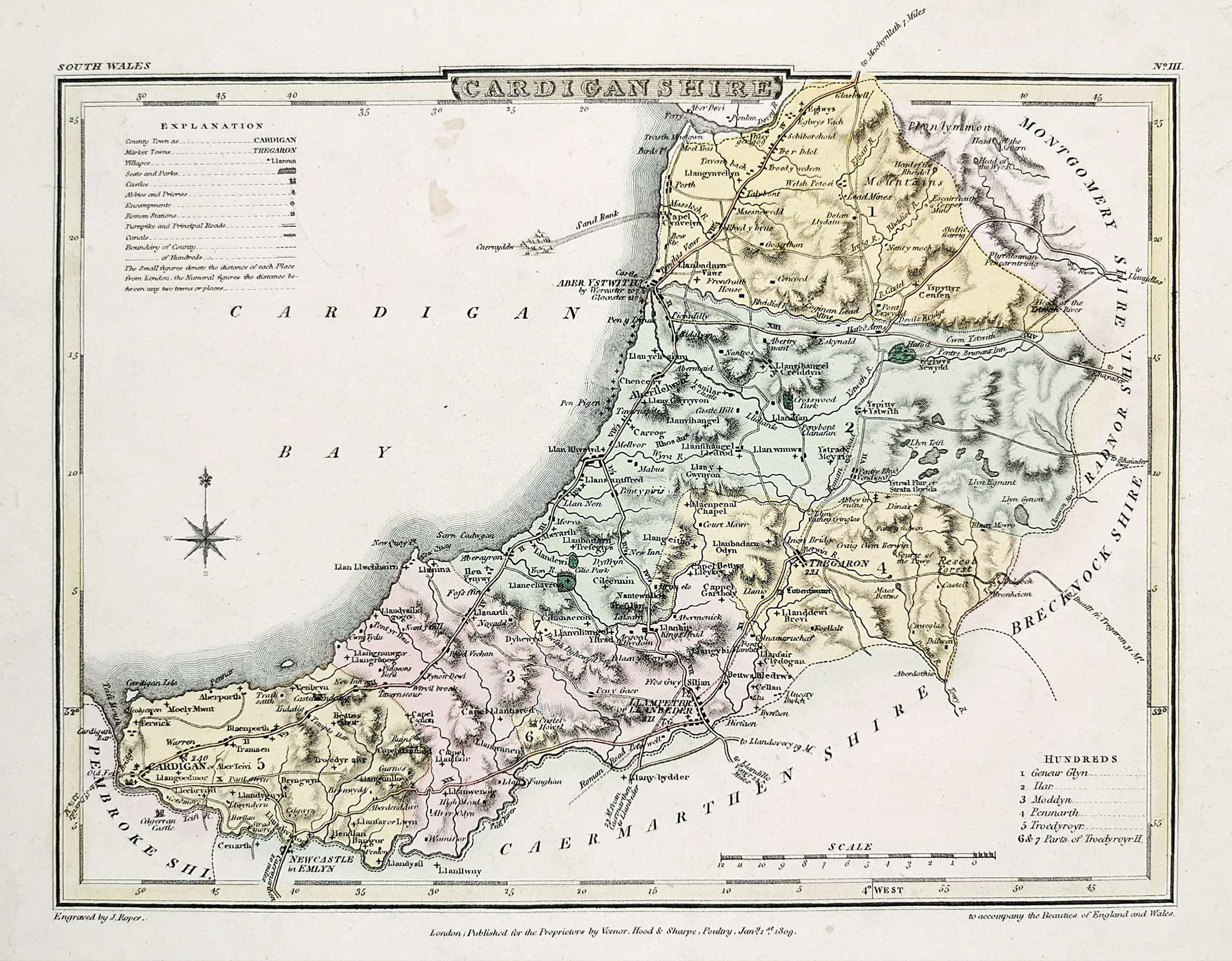 Early c.19th engraved map of Cardinganshire, Wales by John Rober (1711-1810). From Roper, The British atlas comprising a complete set of county maps, of England and Wales; with a general map of navigable rivers and canals; and plans of cities … Read Full Description