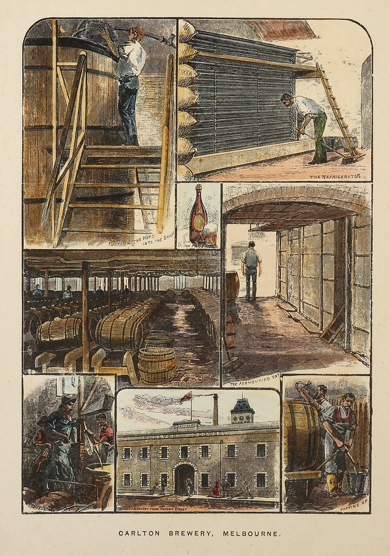 Scarce c.19th hand coloured engraving of Carlton Brewery, Melbourne. Collections: State Library Victoria: MC 919.45 N42I National Library Australia: Bib ID: 2264805 State Library New South Wales: 991021280379702626