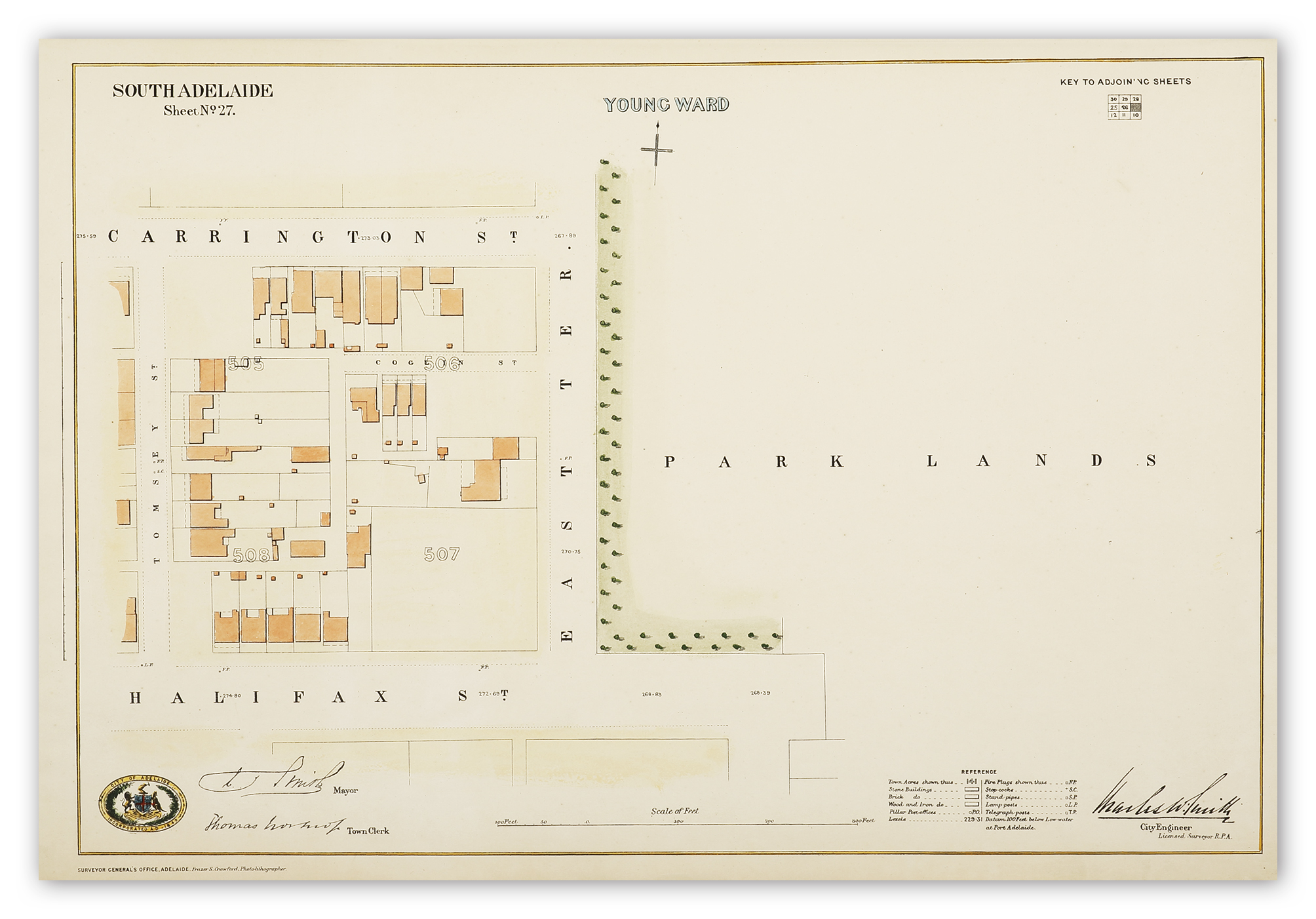 In July 1877 the Adelaide City Council commissioned the eminent English engineer, William Clark (1821-1880) to assess and propose a system of drainage for the city of Adelaide. Clark’s proposal was accepted and prior to commencement of the works Clark required a detailed cadastral survey of the city to be made. On 18 February 1878 the Council instructed John Lloyd Hyndman (1836 – 1878) the City Engineer and Surveyor to prepare a large detailed plan of the city of Adelaide to show; permanent from temporary buildings, the levels not only of the street surfaces, but of the back yards, the levels and positions of cellars where they exist, and points where drainage will be required, such as kitchen sinks, water taps, stack pipes, water closets on a scale of 40 feet to the inch. Work proceeded but on 4th August 1878, Hyndman unexpectedly died and was replaced by the engineer Charles William Smith.
