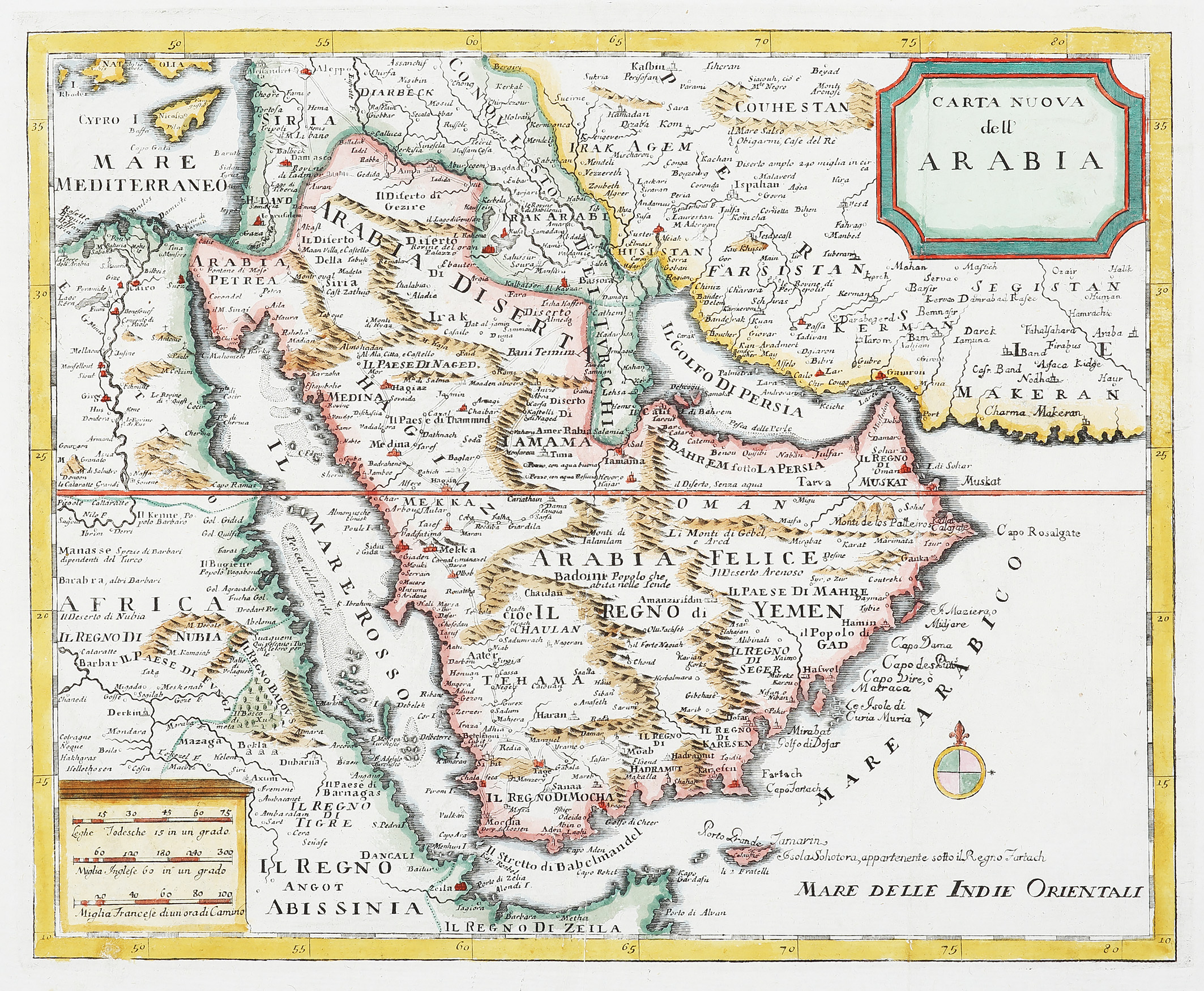 A finely engraved c.18th hand coloured map of the Arabian Peninsula, published by the Venetian printer and cartographer Giovambattista Albrizzi. The map presents a European understanding of Arabia, delineating its principal regions, Arabia Deserta, Arabia Felix, and Arabia Petrea, together with major trade centres, coastal settlements, and interior oases. The Red Sea, Persian Gulf, and Gulf of Aden are rendered with particular clarity, reflecting the commercial and diplomatic interests that animated Venetian and wider European engagement with the region.