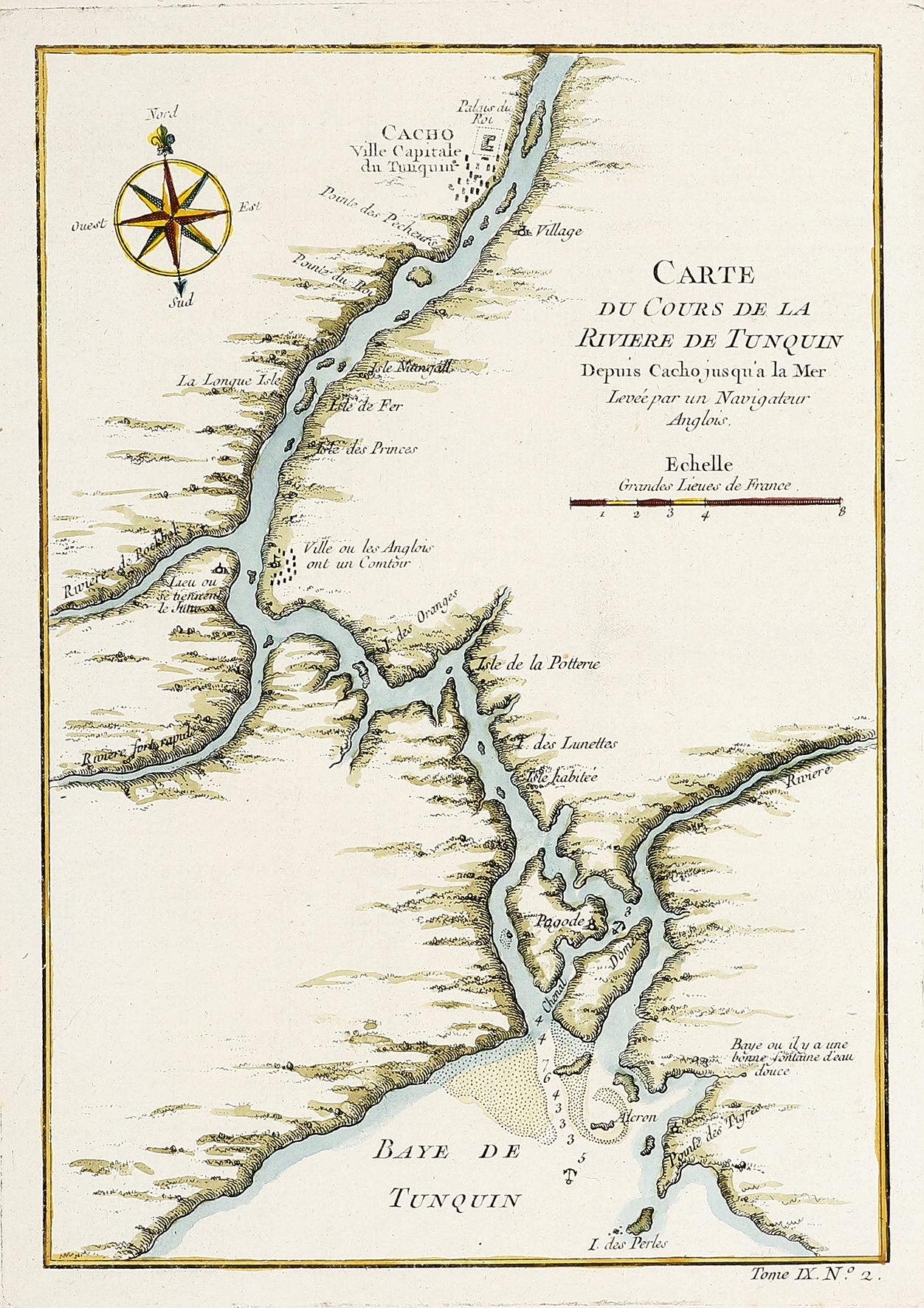 Tonkin, also spelled Tongkin, Tonquin or Tongking, refers to the northern region of Vietnam. During the c.17th and c.18th, this term to the domain Đàng Ngoài under Trịnh lords’ control, including both the Northern and Thanh-Nghệ regions, north of the Gianh River. In 1831, the Nguyen emperor, Minh Mạng renamed the city it Ha Noi (“Between Rivers” or “River Interior”).