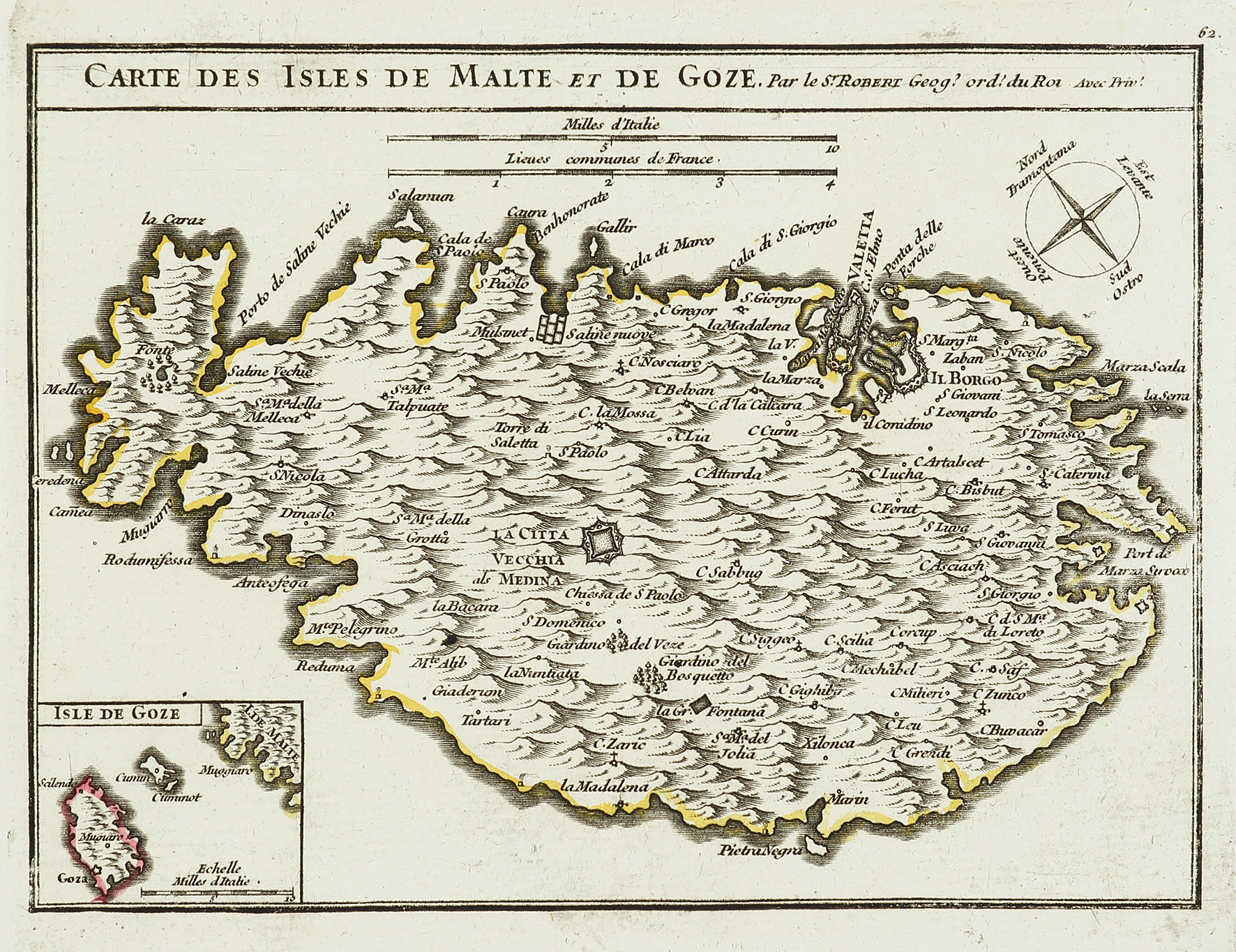 Scarce c.18th French, detailed hand coloured engraved map of Malta with an inset of the Island of Gozo by Robert de Vaugondy (1688-1766). From: Rovert de Vaugondy, Atlas portatif, universel. Composé d’après les meilleures cartes, tant gravées que manuscrites, des plus … Read Full Description