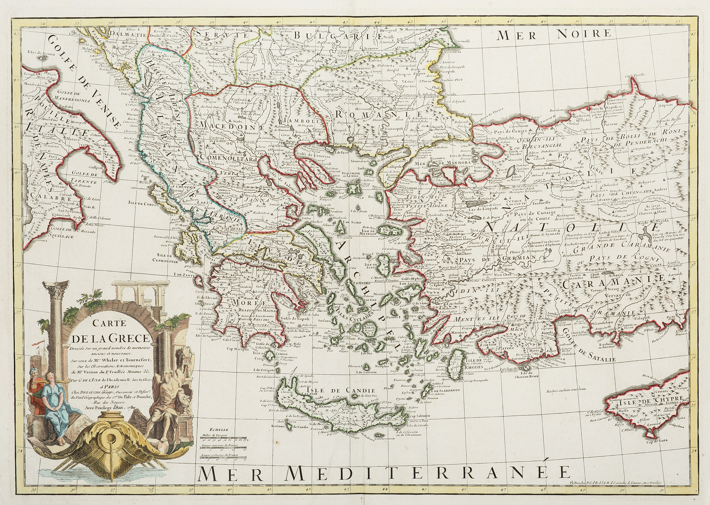 Large scale c.18th detailed map, focusing on Greece, based on De L’Isle’s original and here updated in this issue by Phillippe Buache in 1780. The map extends from the Gulf of Venice Greece and the Balkans and west to include Turkey. A superb large decorative title cartouche is at lower left.