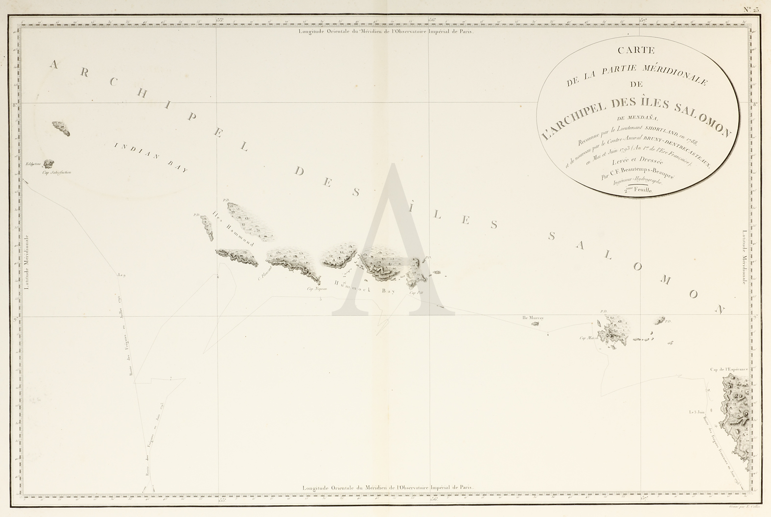 Large scale map of the Solomon Islands, showing the tracks of Recherche and Esperance in 1792-1793 from the official account of D’Entrecasteux’s voyage. D’Entrecasteaux in the ships, La Recherche and L’Esp�rance under Huon de Kermadec, sailed in 1791 sailed via the Cape of Good Hope, along the southern Australia coast from Cape Leeuwin easterly, and then into the Pacific. With orders not only to search for La Perouse but to also make scientific discoveries and to chart the coasts. They were instructed to the accuracy of the exisiting earlier Dutch and d’Apres charts of the South Indian and South Pacific Oceans. The hydrographer on the expedition was Beautemps-Beaupre. Tooley 1626
