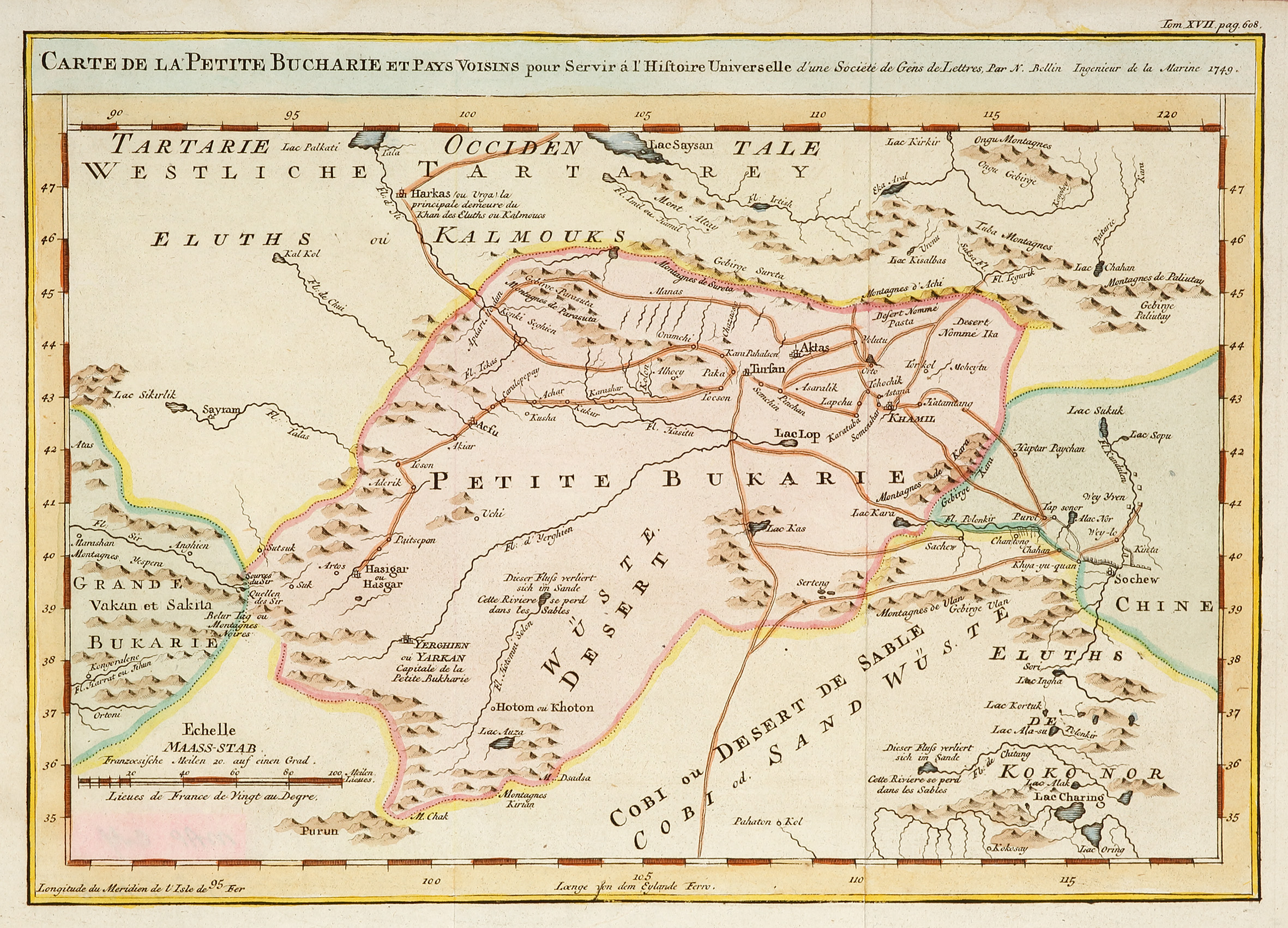 Map focusing on Xinjiang province in China based on the geographic surveys conducted by the French Jesuits. From, Histoire Generale des Voyages.