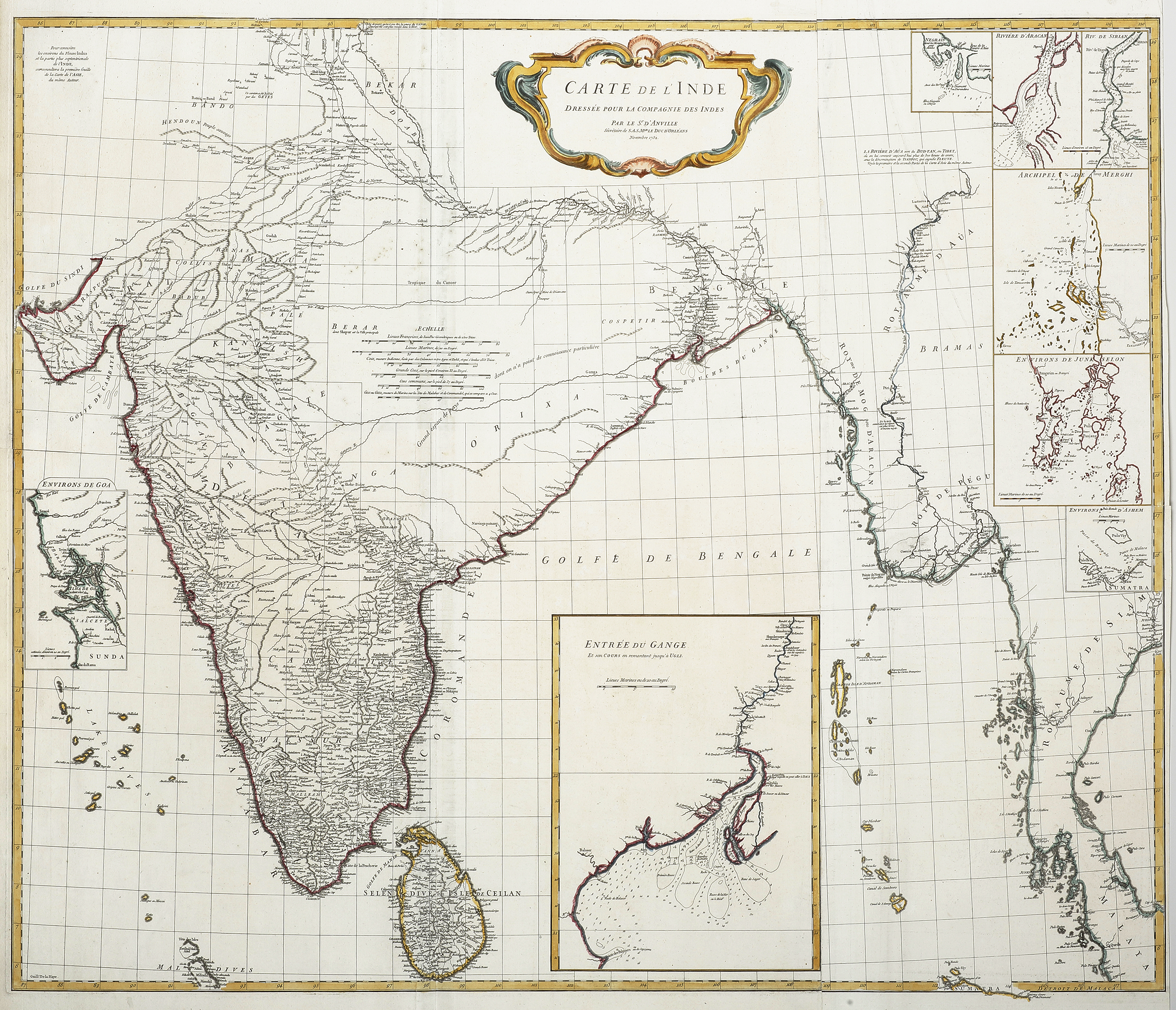 Insets: Negrais Riviere d’Aracan Riv. de Sirian Archipel de Merghi Environs de Junk Selon Environs d’Ashem Entree du Gange Environs de Goa.