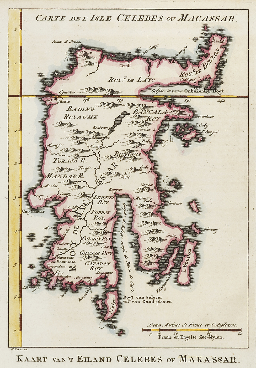 Scarce c.18th French map of the bay of present day Ujung Pandang, formerly the Makasar capital of Sulawesi, Indonesia. The Dutch supplanted the Portuguese, triumphing over the sultan in 1667. From Prevost, Abbe. Histoire générale des voyages : ou, Nouvelle collection … Read Full Description