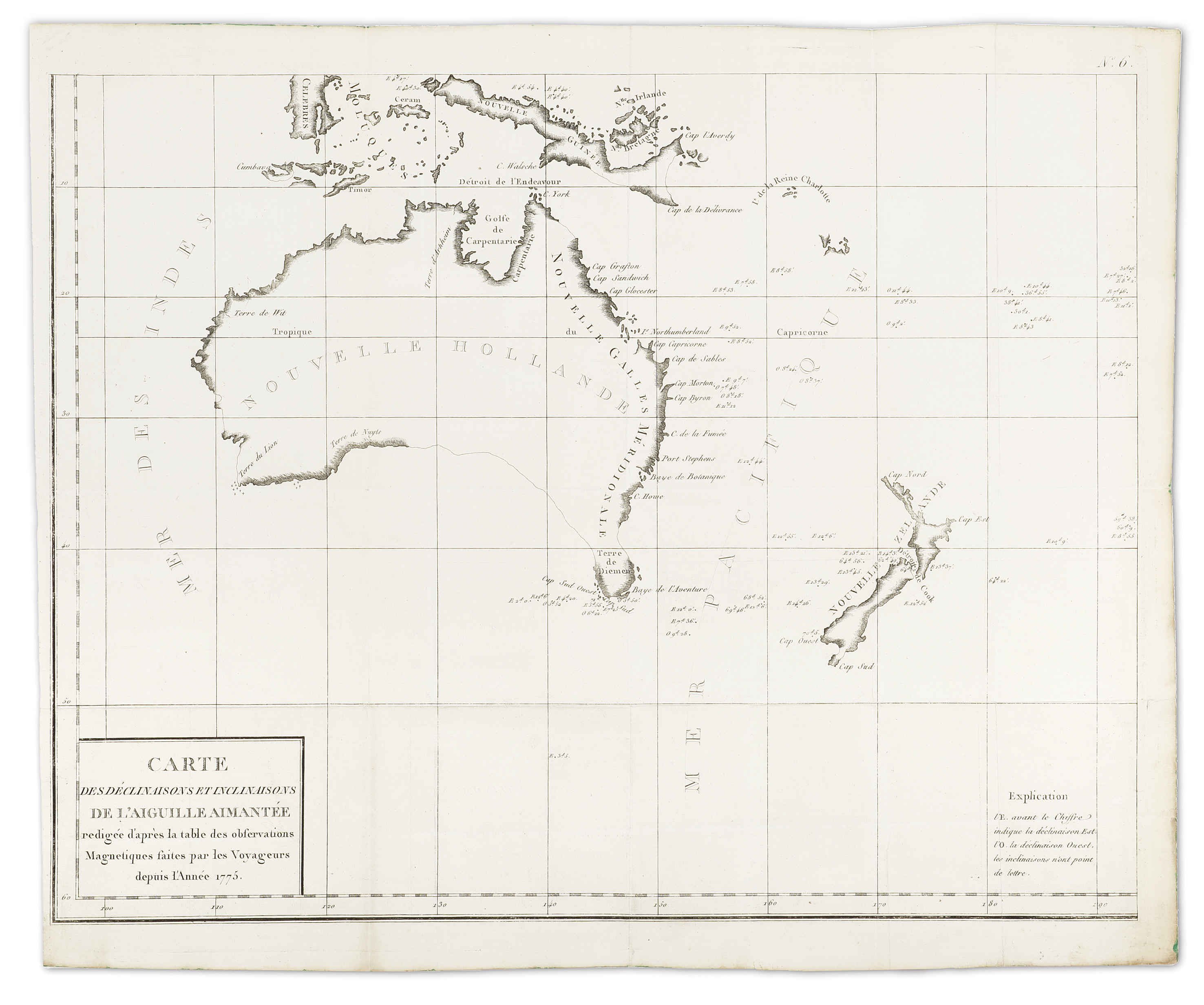 Rare large scale c.18th French map of Australia, one of eight maps published to accompany Buffon’s treatise on magnetism by Jean-Charles Borda the French cartographer, mathematician, physicist, political scientist, and mariner. This is one of the few C18th maps to solely focus on Australia.