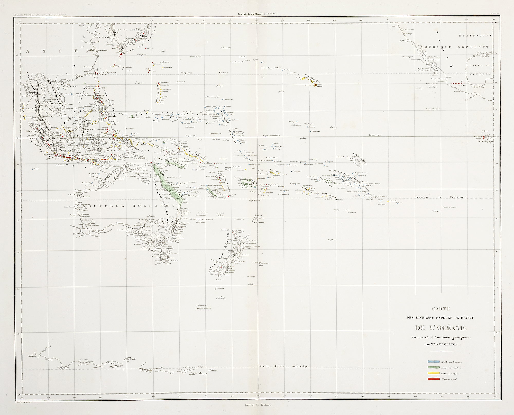Rare c.19th geological map of the Pacific from the final voyage accounts of Dumont D’Urville.