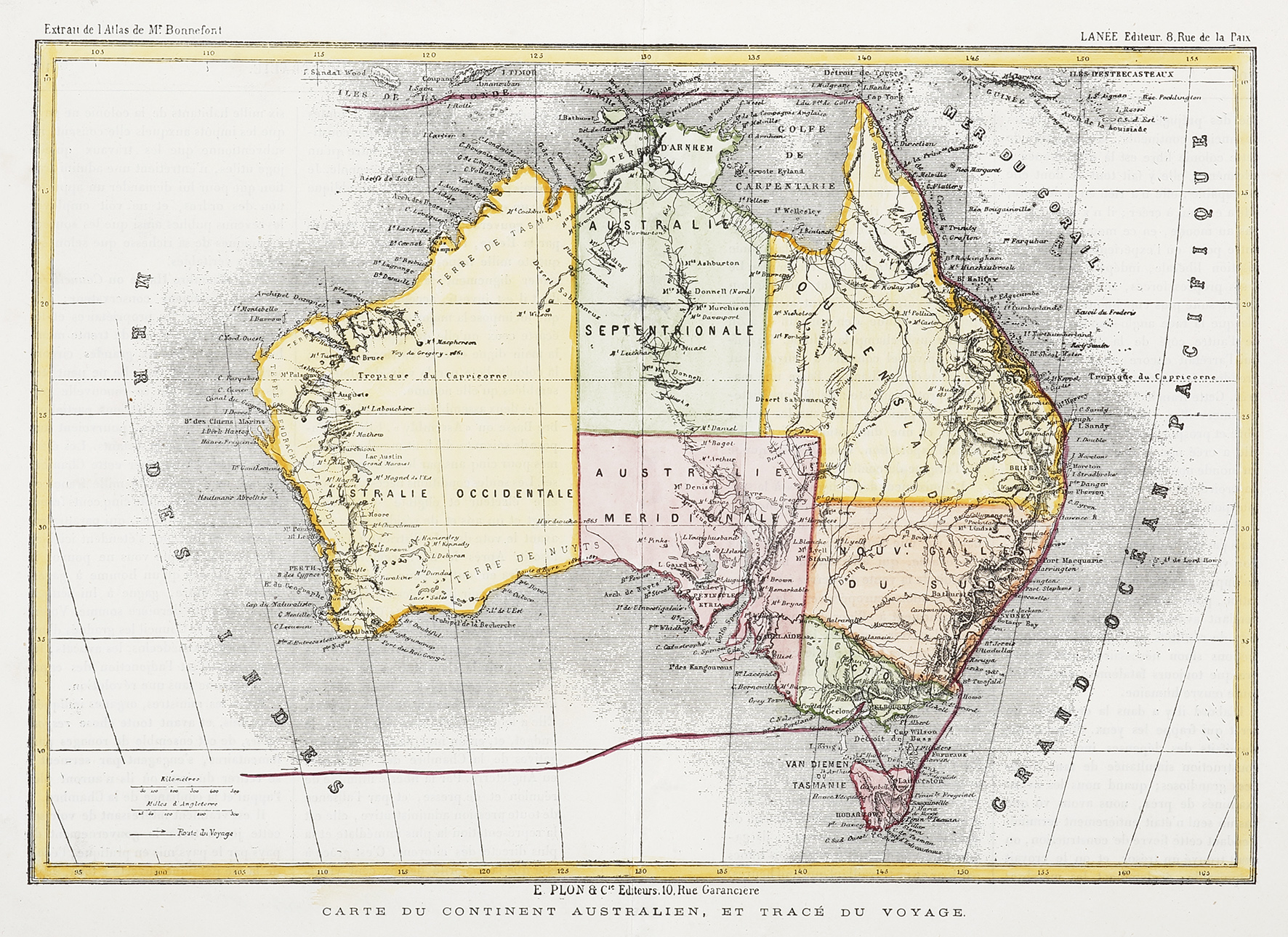 Attractive French map of Australia with good inland information, noting numerous explorers and dates of discoveries. The tracks of the French explorer, Count Ludovic de Beauvoir (1846 – 1929) are shown from south-west, along east coast to north-west by unnamed explorer. Shows names and dates of explorers in Australia, the latest being 1865.