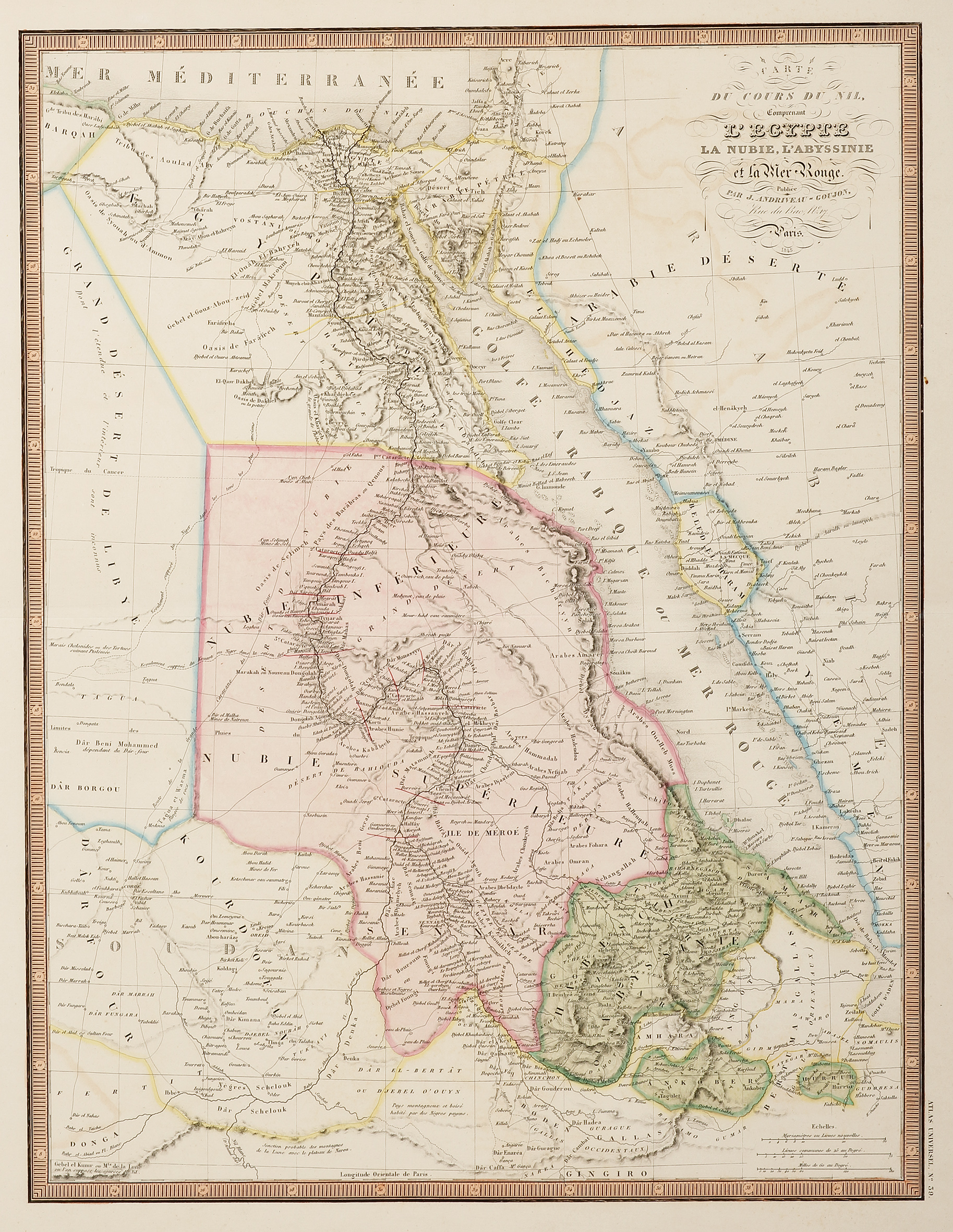 Very detailed large scale map showing the course of the Nile by J. Andriveau-Goujon. Although the map is dated 1845, the atlas which this map came from wasn’t published until 1847.