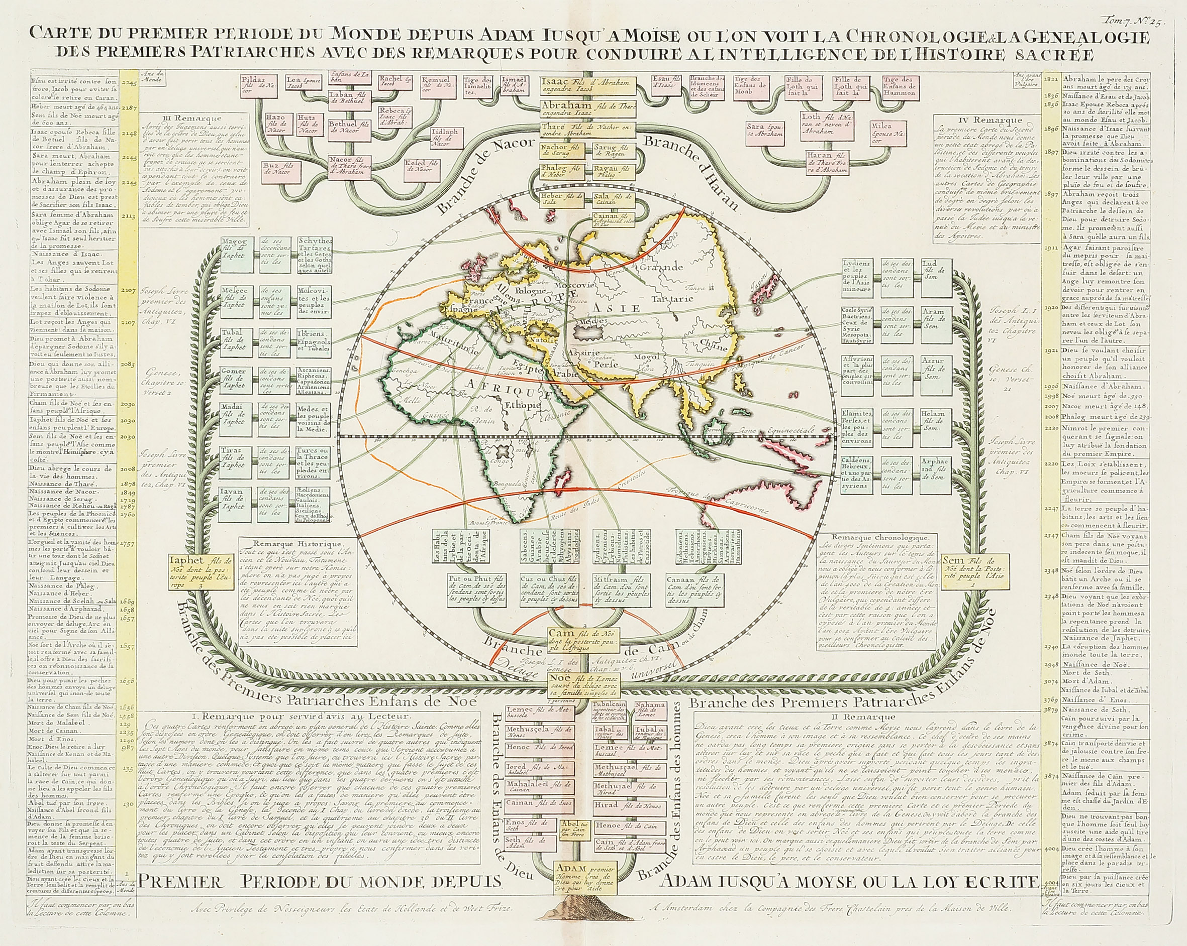 The map depicts the world as understood in the Biblical First Period, from the Creation and the time of Adam through the generations of the early Patriarchs. Rather than presenting geography alone, the composition integrates cartography with extensive chronological tables and genealogical trees tracing descent from Adam through his immediate successors.