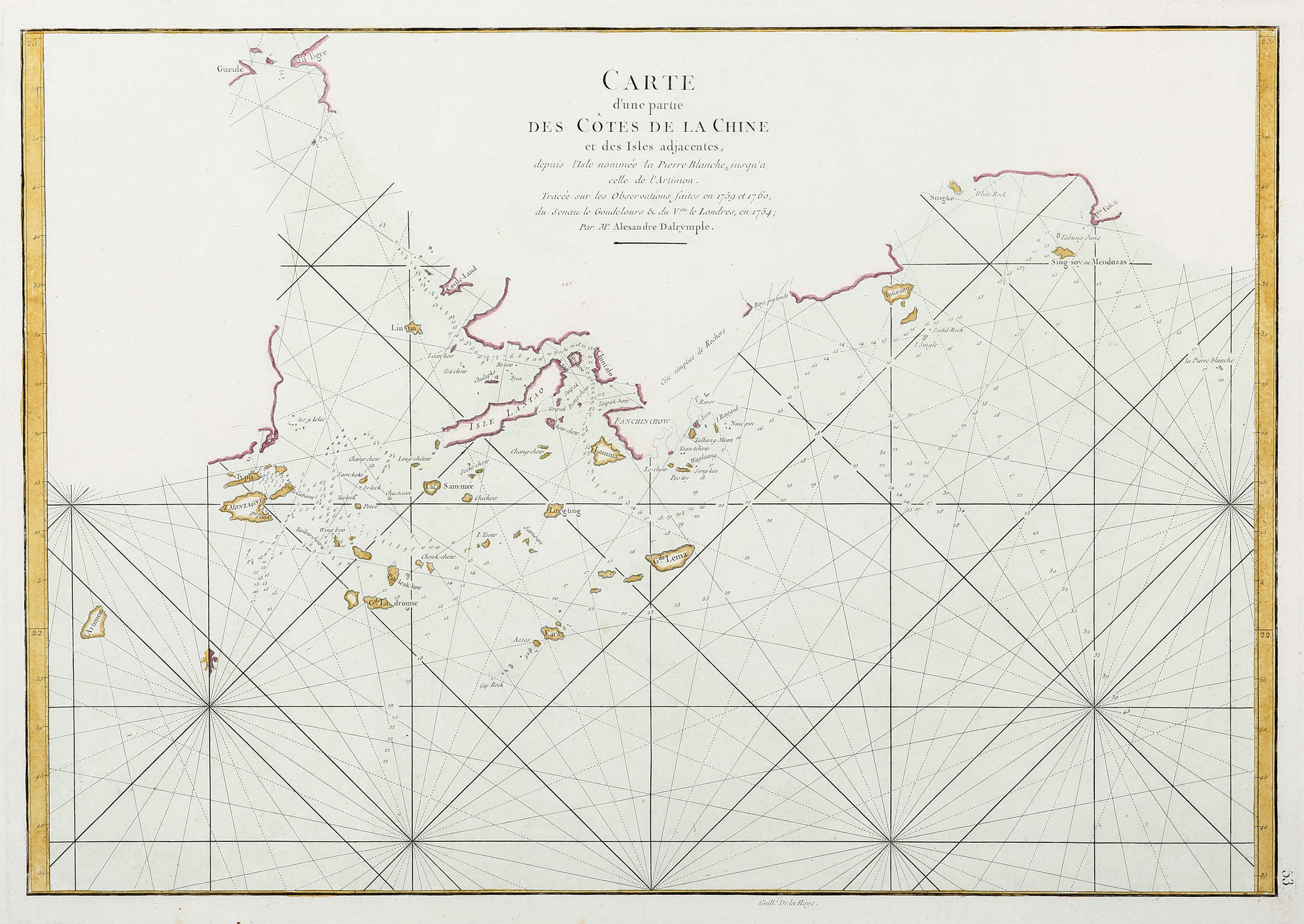Important c.18th chart of Hong Kong based upon the surveys made from the original surveys and soundings in 1754, 1759, and 1760 by Alexander Dalrymple. This edition of Dalrymple’s map was published by Jean-Baptiste D’Apres de Mannevillette in his later editions of Neptune Orientale, the most highly regarded pilot for the Eastern trade for both French and English ships. The chart is dedicated to Alexander Dalrymple hydrographer to Britain’s East India Company. Mannevillette was one of the few cartographers that had the admiration of the the difficult, Alexander Dalrymple. The two collaborated and shared information with the aim of updating current navigational charts.