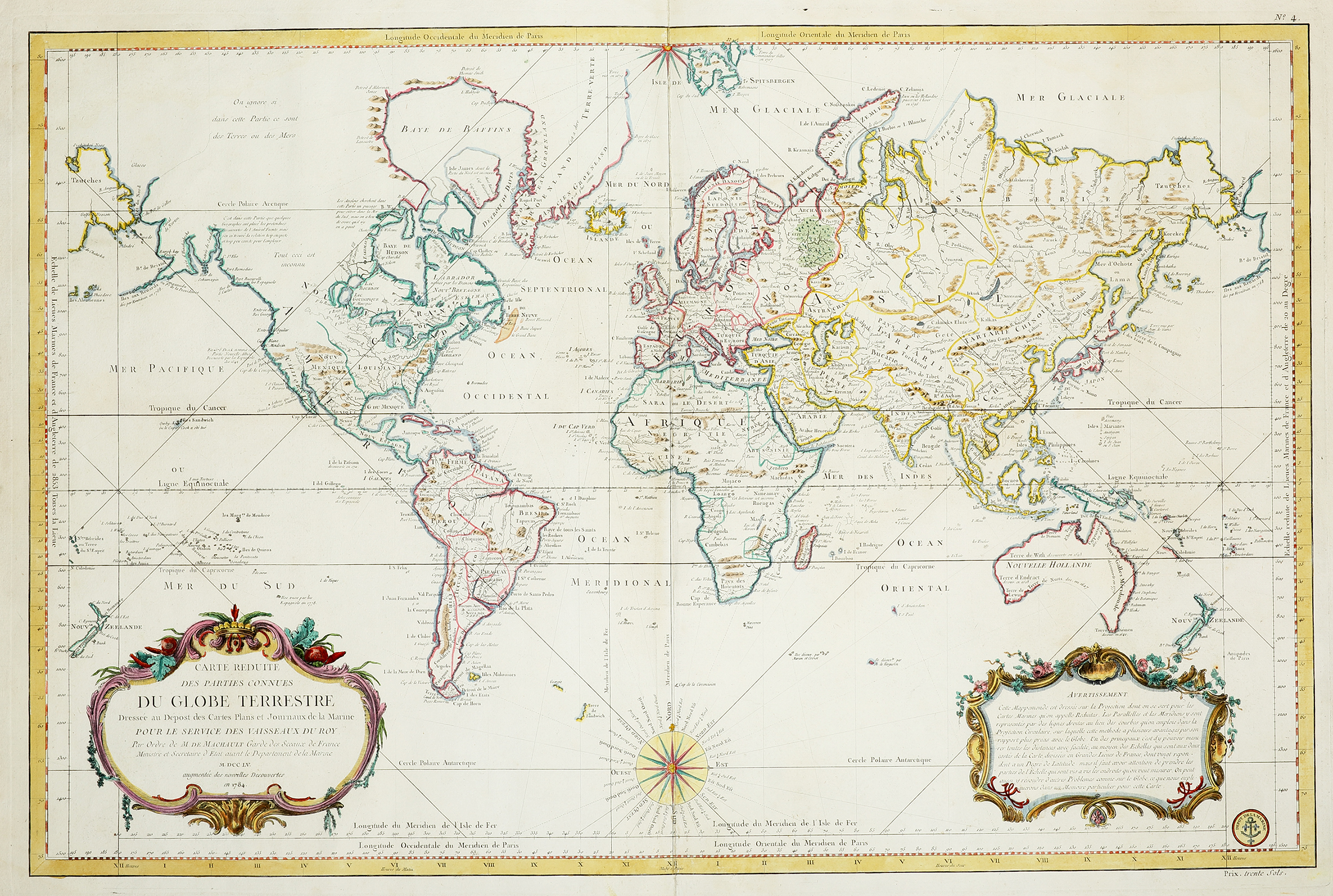 Large scale world chart on Mercator’s Projection by this famous French cartographer issued by Depot General de la Marine. Two large Rocco frames enclose the title at lower left and an advertisement at lower right. Bellin issued this chart in … Read Full Description