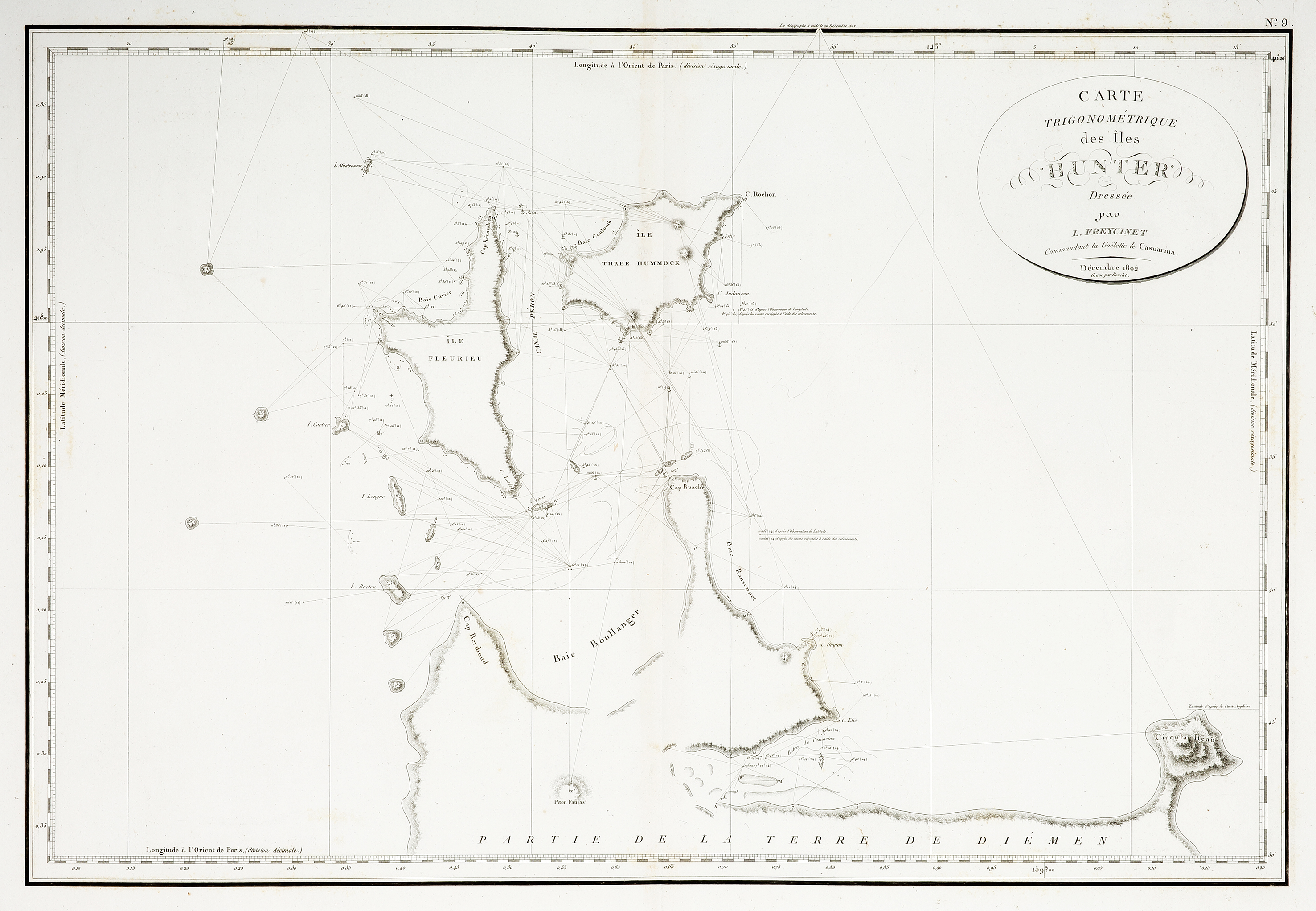 Rare Freycinet map from the accounts of the Baudin voyage of exploration. Map of Hunter Island off N.W. coast of Tasmania showing tracks of Le Casuarina. Inset: Iles Hunter d’apres la carte du Cape. Flinders, levee en 1798. Tooley 631 … Read Full Description