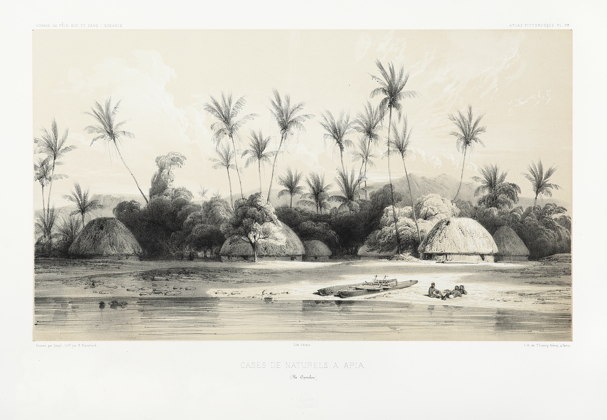Superb c.19th lithograph of a Samoan village on the beach of present Apia Harbour, on Upolu Island, Samoa. From D’Urville, D. Voyage au Pole Sud et dans l’Océanie sur les corvettes l’Astrolabe et la Zélée, exécute par ordre du roi pendant … Read Full Description