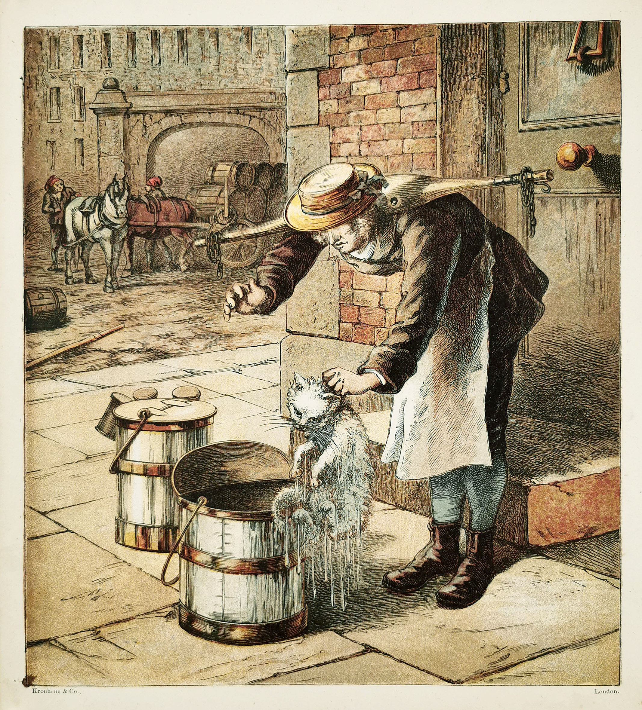 Victorian engraving of a cat being pulled out of the milk mans container.