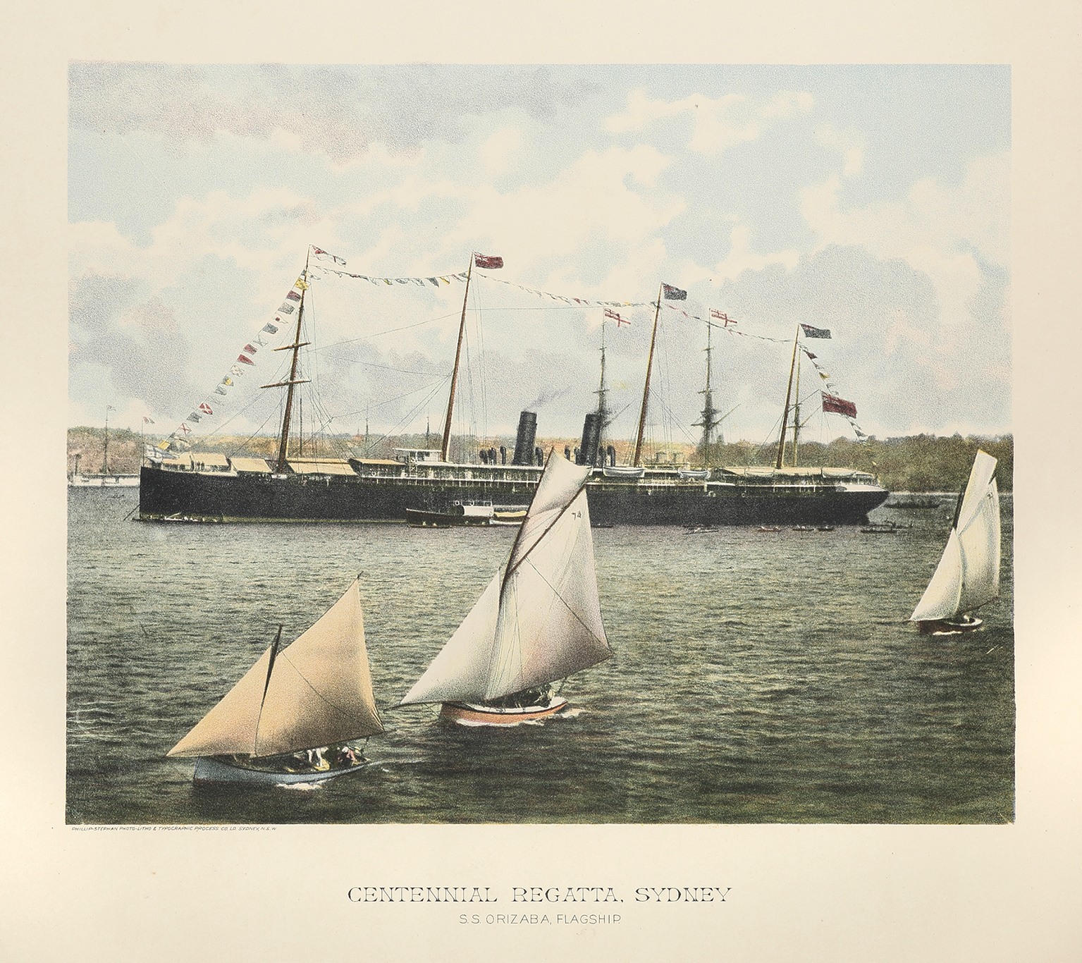 Superb large lithograph of yachting on Sydney Harbour with S.S. Orizaba. Rare.