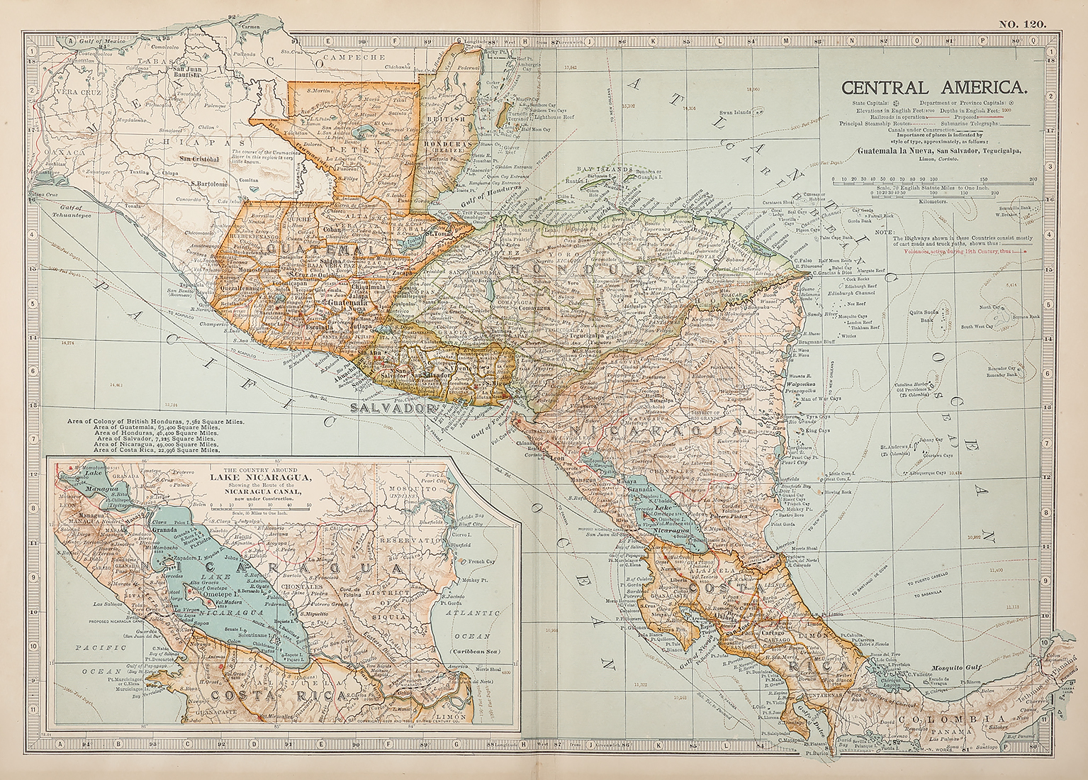 Detailed early c.20th map of central America with an inset of the country around Lake Nicragua showing the route of the Nicaragua Canal.