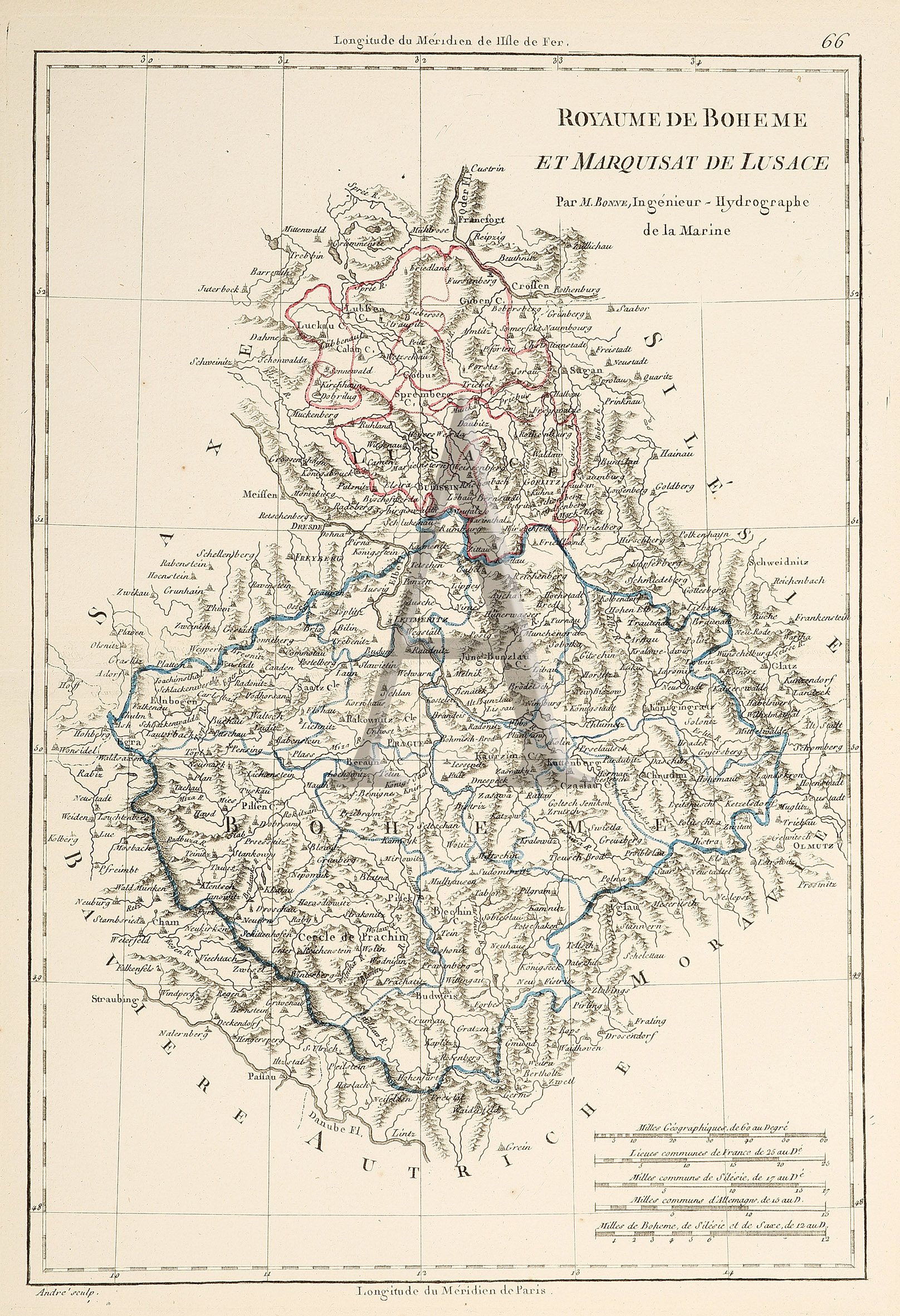 Bonne was an important French cartographer active in the later part of the C18th. In 1773 Bonne succeeded Jacques Nicolas Bellin as Royal Cartographer to France in the office of the Hydrographer at the Depôt de la Marine. Working in his official capacity, Bonne compiled some of the most detailed and accurate maps of the period. Bonne’s work represents an important step in the evolution of the cartographic ideology away from the decorative work of the 17th and early 18th century towards a more detail oriented and practical aesthetic.