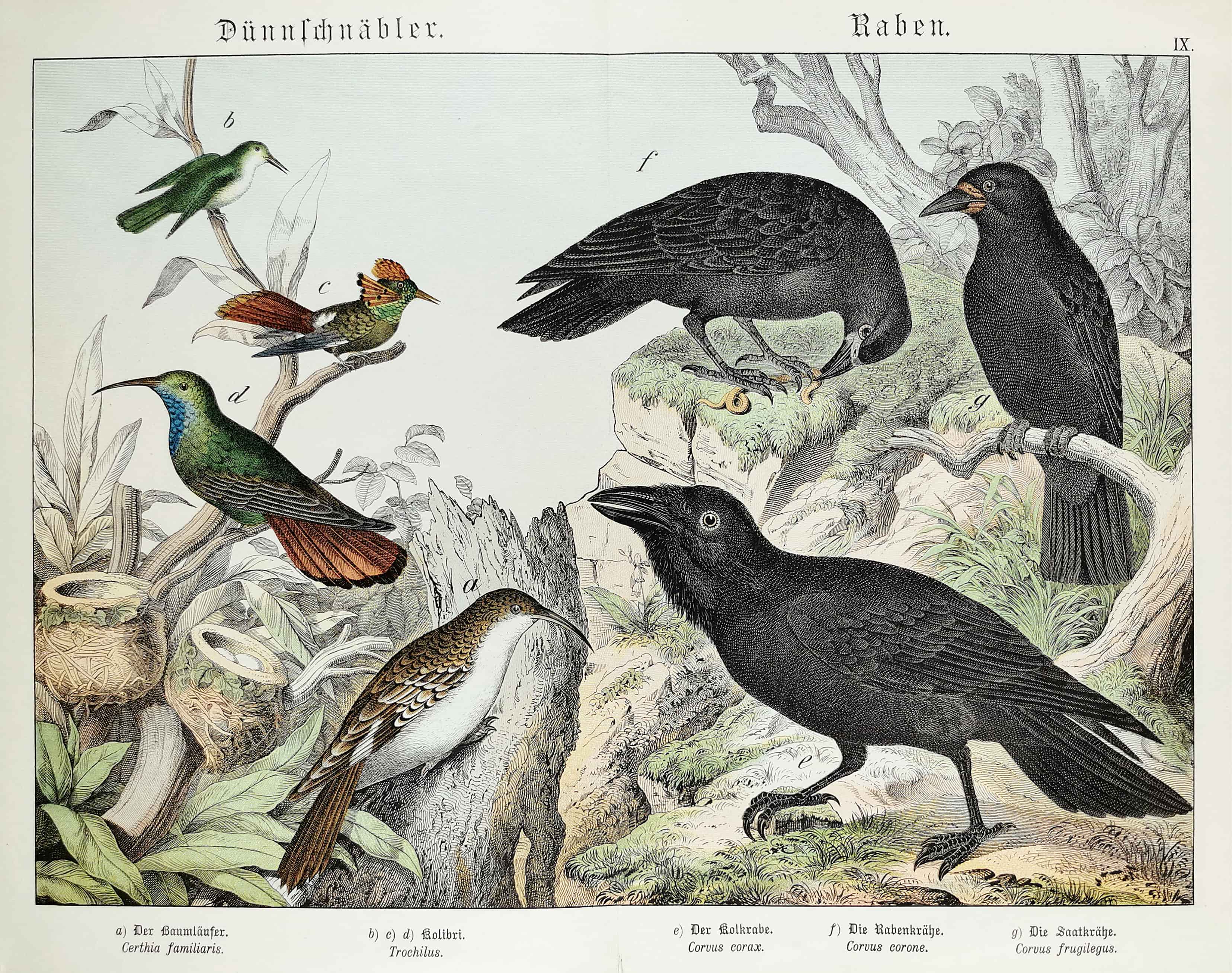 German c.19th lithograph of the Eurasian treecreeper, Hummingbird, Common raven, Carrion crow and Rook.