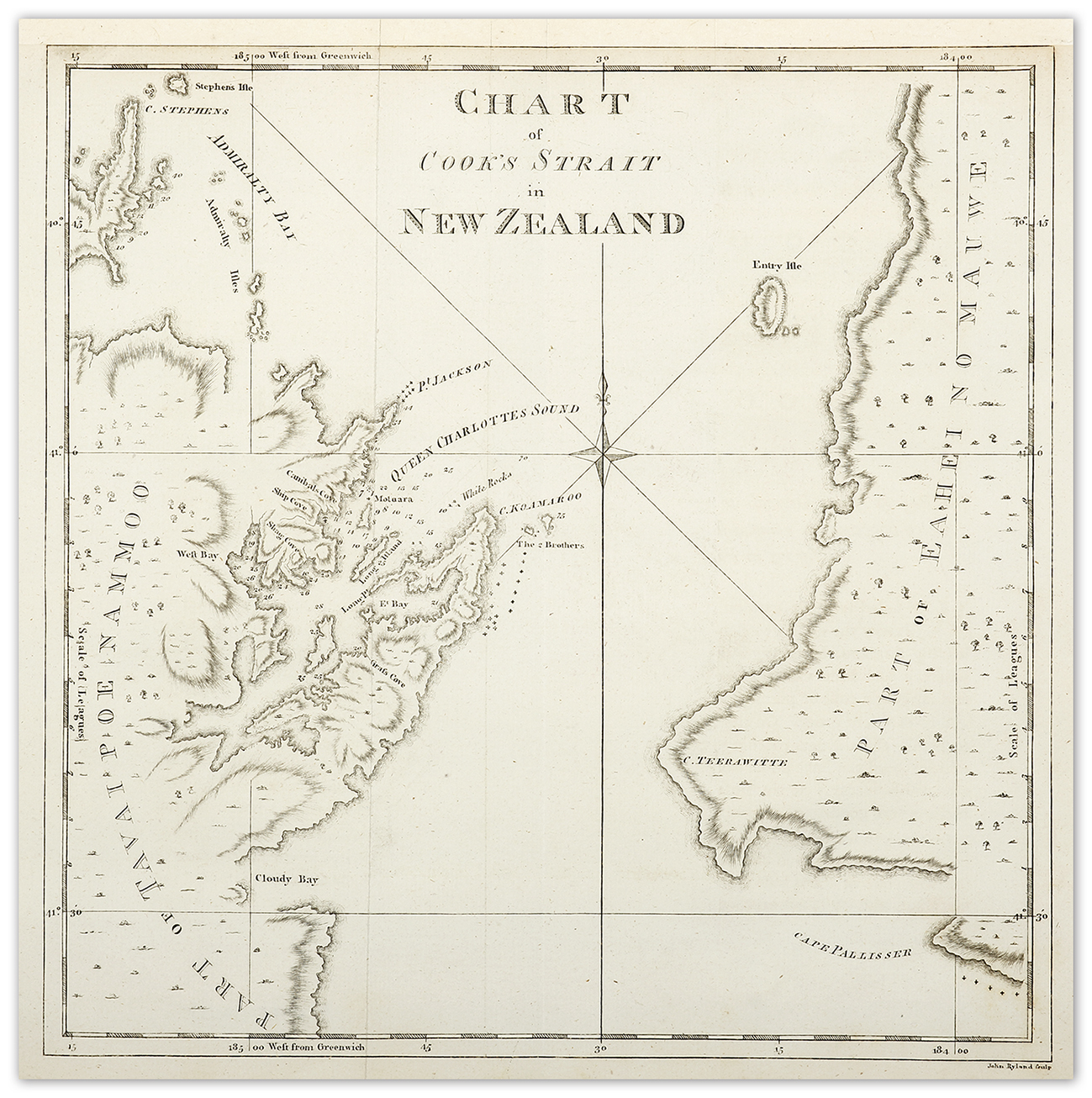 First edition of Cook’s chart of Cook’s Strait, New Zealand, issued in the official British Admiralty sanctioned edition accounts of Cook’s first voyage. This is the first and most superior issue of this chart and identified by the position of the title at top, within the map area, whereas later issues by other publishers placed the title outside the map area.