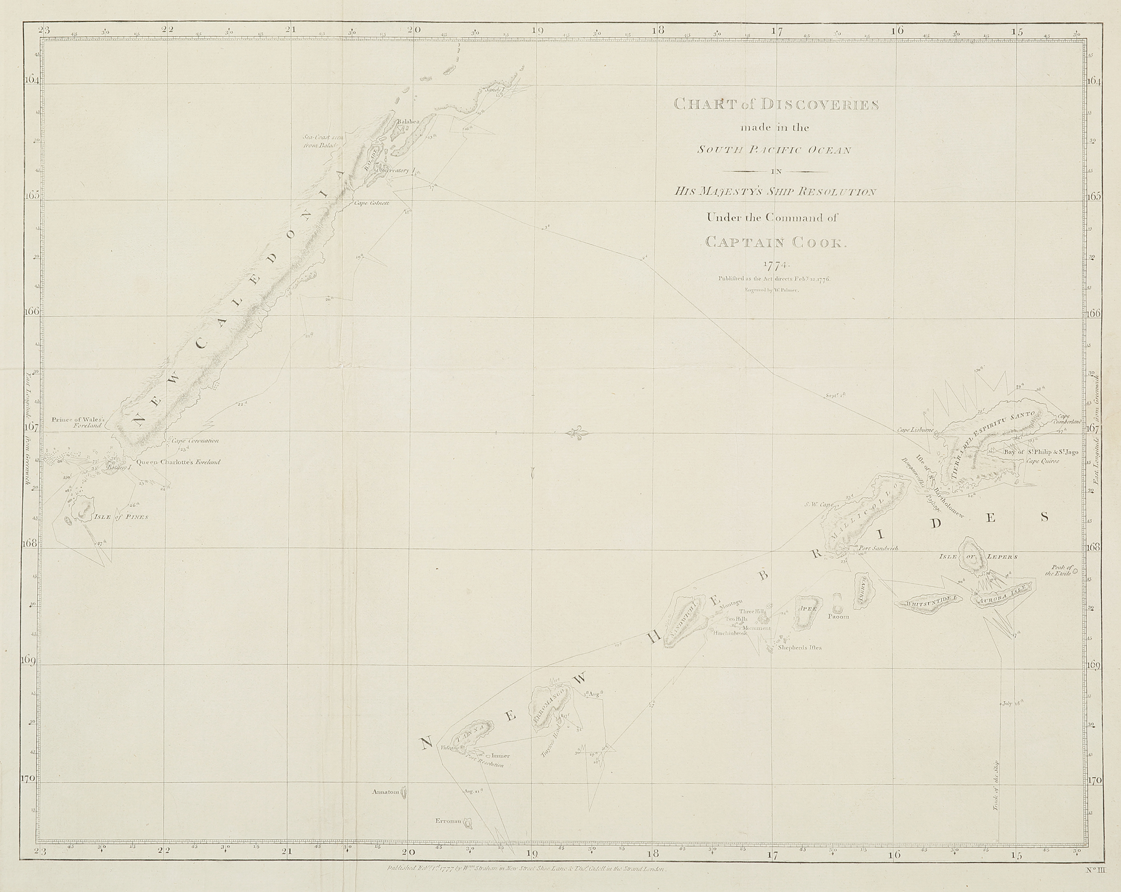 The first printed chart of New Caledonia also showing Vanuatu, dated February 1st 1777, from the official British Admiralty sanctioned edition of the accounts of Cook’s second voyage.